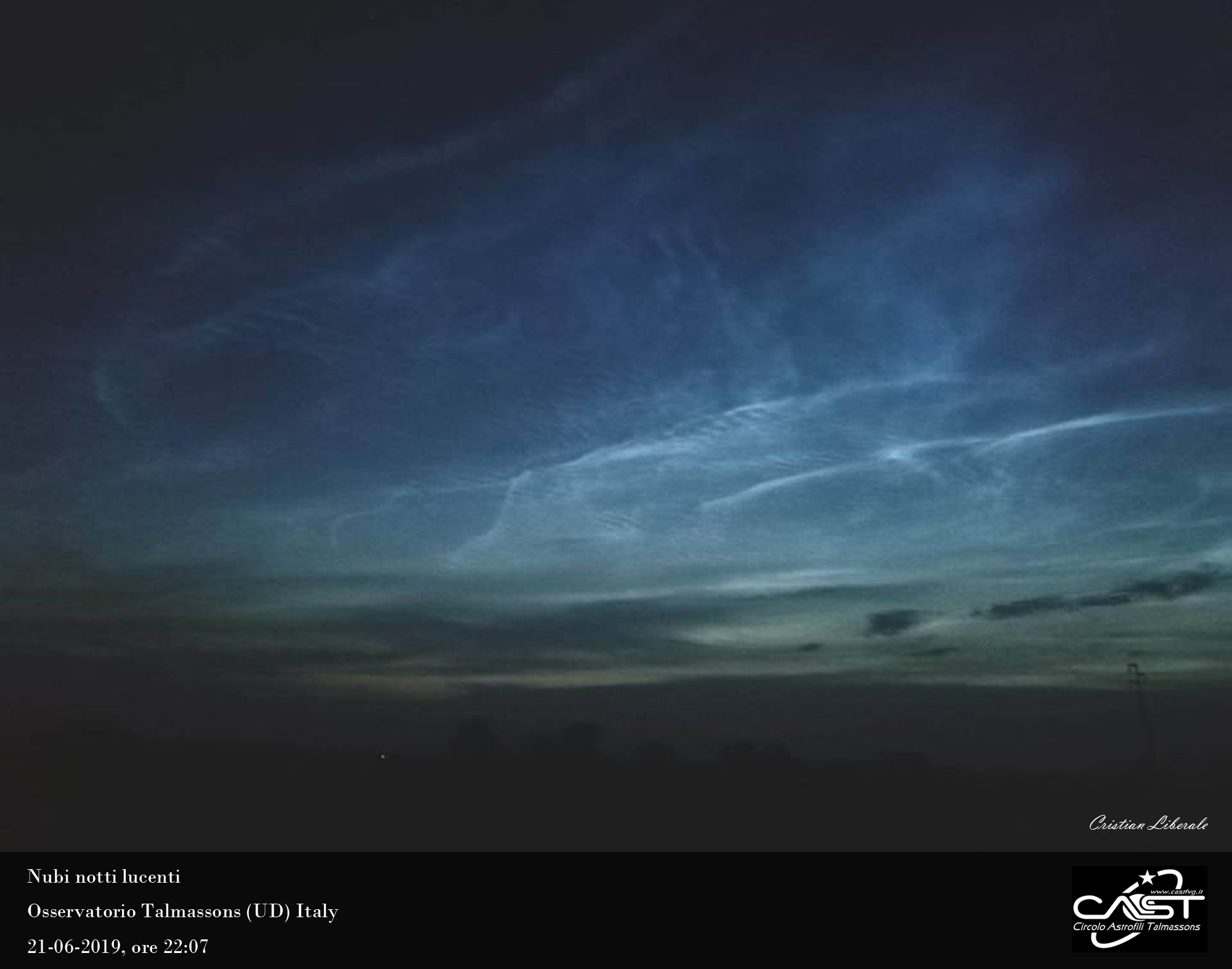 Per me e’ la prima volta che vedo le nubi nottilucenti (in inglese NoctiLucent Clouds, sigla NLC), note anche come nubi polari mesosferiche (in inglese Polar Mesospheric Clouds, sigla PMC), sono un fenomeno atmosferico nuvoloso visibile durante il crepuscolo inoltrato. Si possono osservare con maggiore frequenza nei mesi estivi a latitudini tra i 50° e il 70°, sia a nord che a sud dell’equatore. Le nubi nottilucenti sono correlate con i Minimi solari, ossia il loro numero aumenta quando diminuiscono le macchie solari e viceversa.