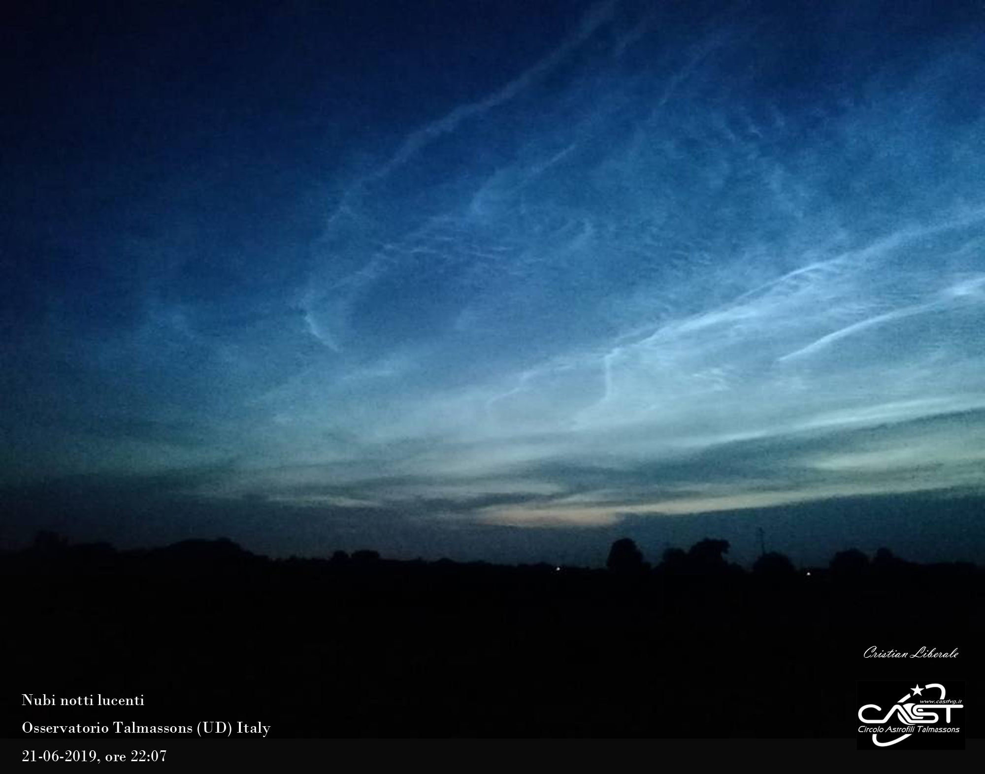 Per me e’ stata la prima volta a vedere le nubi nottilucenti (in inglese NoctiLucent Clouds, sigla NLC), note anche come nubi polari mesosferiche (in inglese Polar Mesospheric Clouds, sigla PMC), sono un fenomeno atmosferico nuvoloso visibile durante il crepuscolo inoltrato. Si possono osservare con maggiore frequenza nei mesi estivi a latitudini tra i 50° e il 70°, sia a nord che a sud dell’equatore. Le nubi nottilucenti sono correlate con i Minimi solari, ossia il loro numero aumenta quando diminuiscono le macchie solari e viceversa.