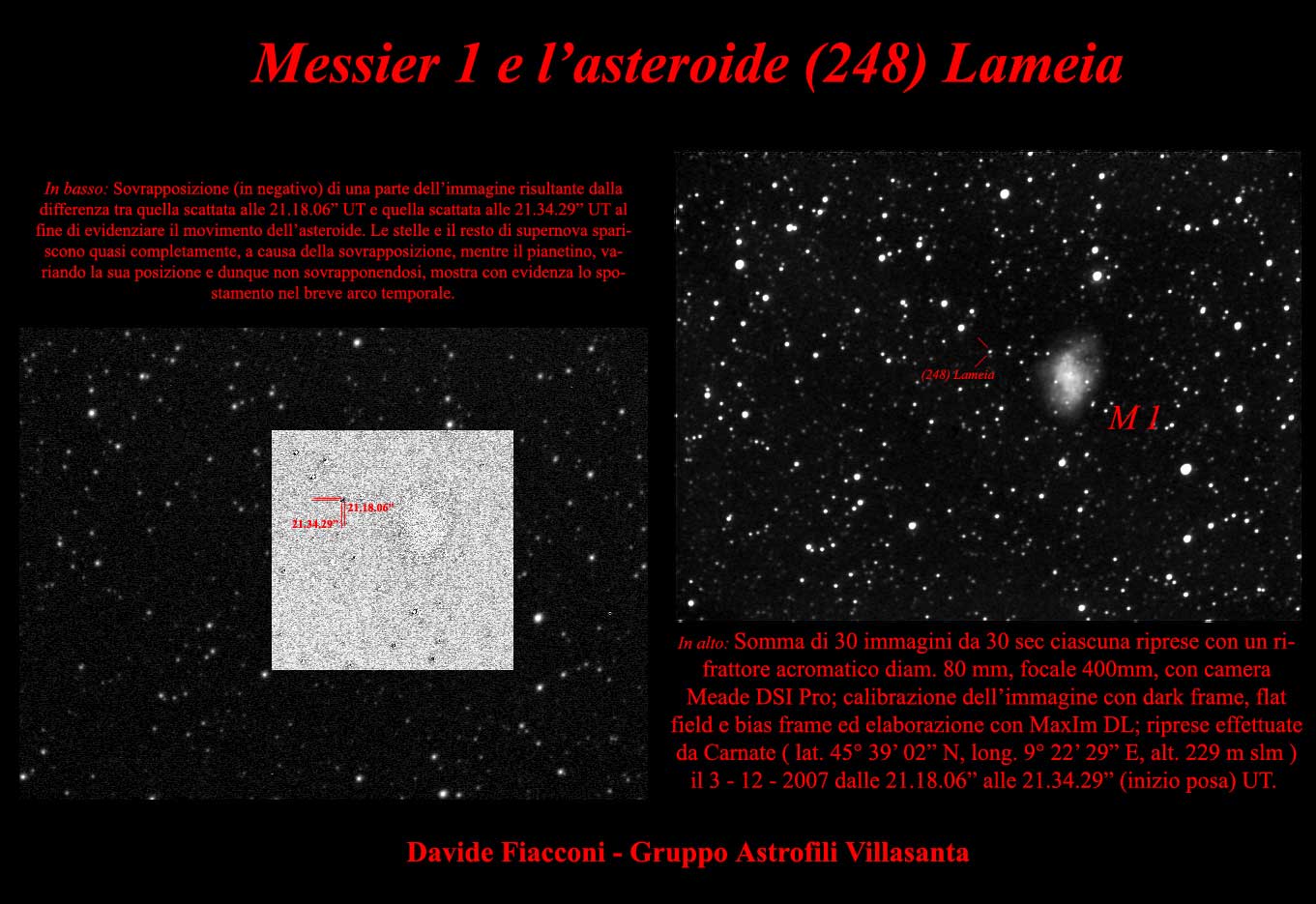 Ripresa di M1 in cui compare l’asteroide 248 Lameia. Immagine ripresa con un rifrattore 80/400 munito di camera Meade DSI su Vixen GP su colonna da Carnate. Tramite un blink tra la prima e l’ultima immagine ci si e’ accorti della presenza dell’asteroide, colto per caso a passarle affianco.