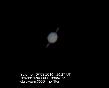 Il Signore degli anelli. Prime riprese di Saturno effettuata con newton 130/900. Serata ventosa e pianeta ancora basso.