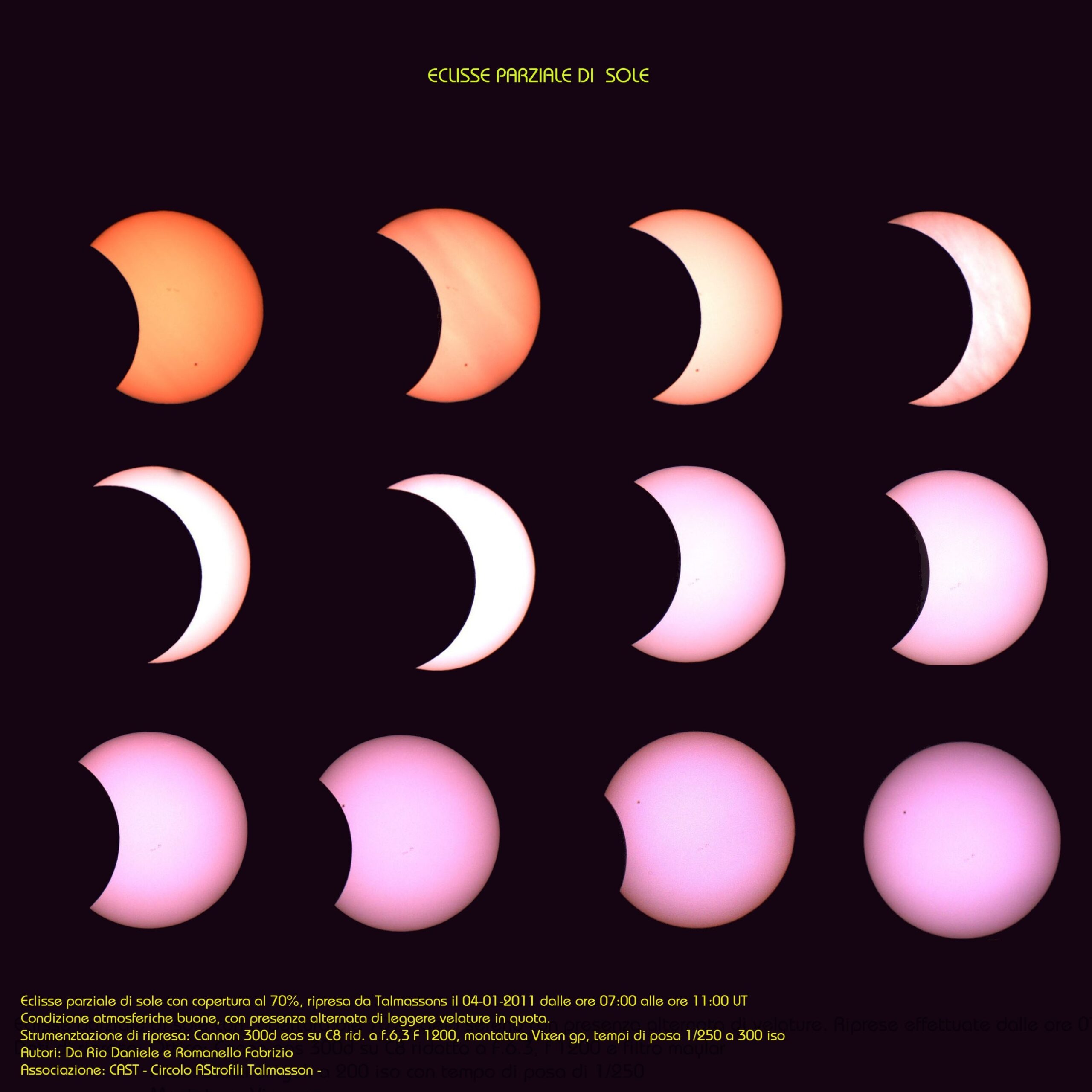 le immagini del mosaico risultano con diversi colori inquanto è stata usata sempre la stessa esposizione (1/250 400 iso) e in alcune immagini la luce risulta sottoesposta (quando il sole era basso sull’orizzonte) e in altre la ns stella è stata leggermente sovraesposta (quando il sole era più alto)