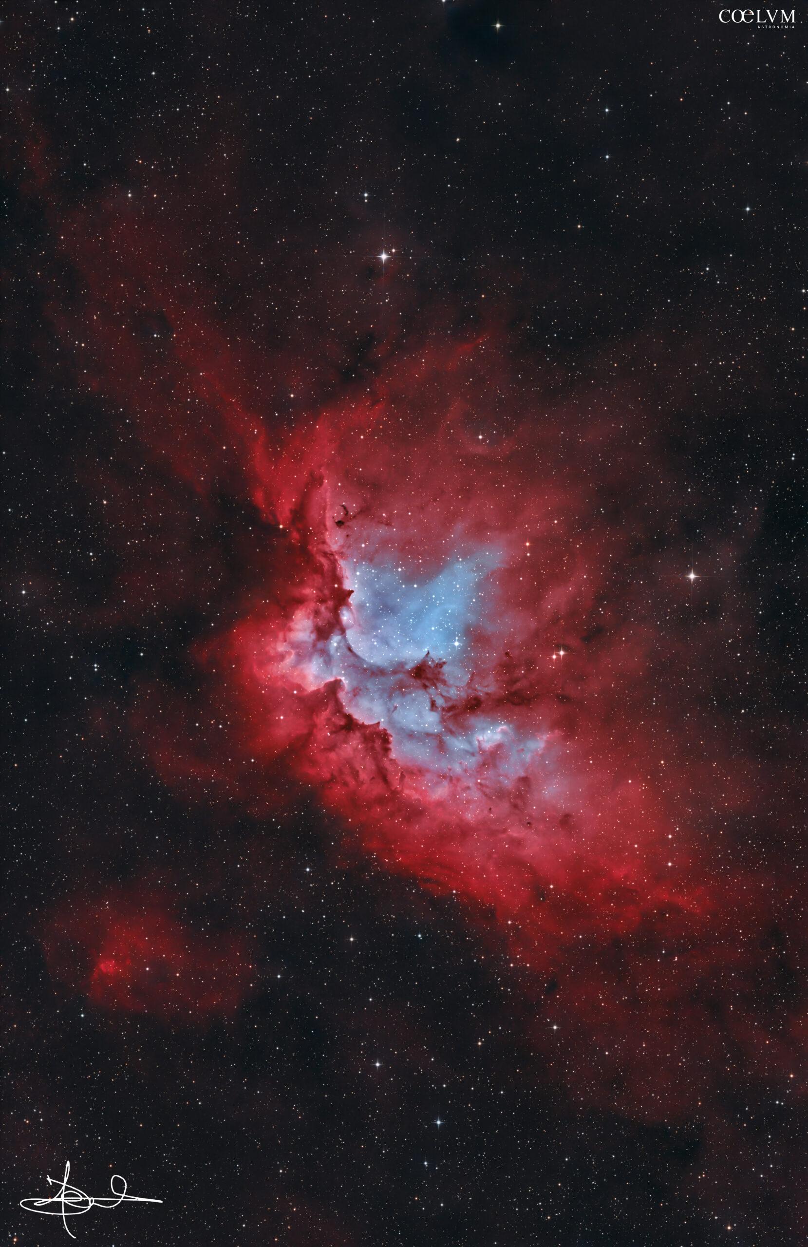 Situata a circa 7.000 anni luce da noi, nella costellazione di Cefeo, la Nebulosa Mago è una regione di formazione stellare dove il gas e la polvere interstellare si intrecciano in una danza cosmica. Il suo nome deriva dalla forma evocativa che ricorda un mago con il braccio teso e la veste svolazzante. Questa nebulosa a emissione è alimentata da un giovane ammasso stellare al suo centro, composto da stelle calde e massicce che emettono radiazione ultravioletta. Questa radiazione ionizza l’idrogeno circostante, facendolo brillare di un rosso intenso, mentre la polvere diffonde la luce blu, creando un contrasto spettacolare. 🔭 Per gli astrofotografi, è una vera musa celeste: le sue strutture scolpite dai venti stellari e le strisce di polvere che tracciano intricati disegni la rendono un soggetto affascinante e sempre diverso da immortalare. @daniloskypix
