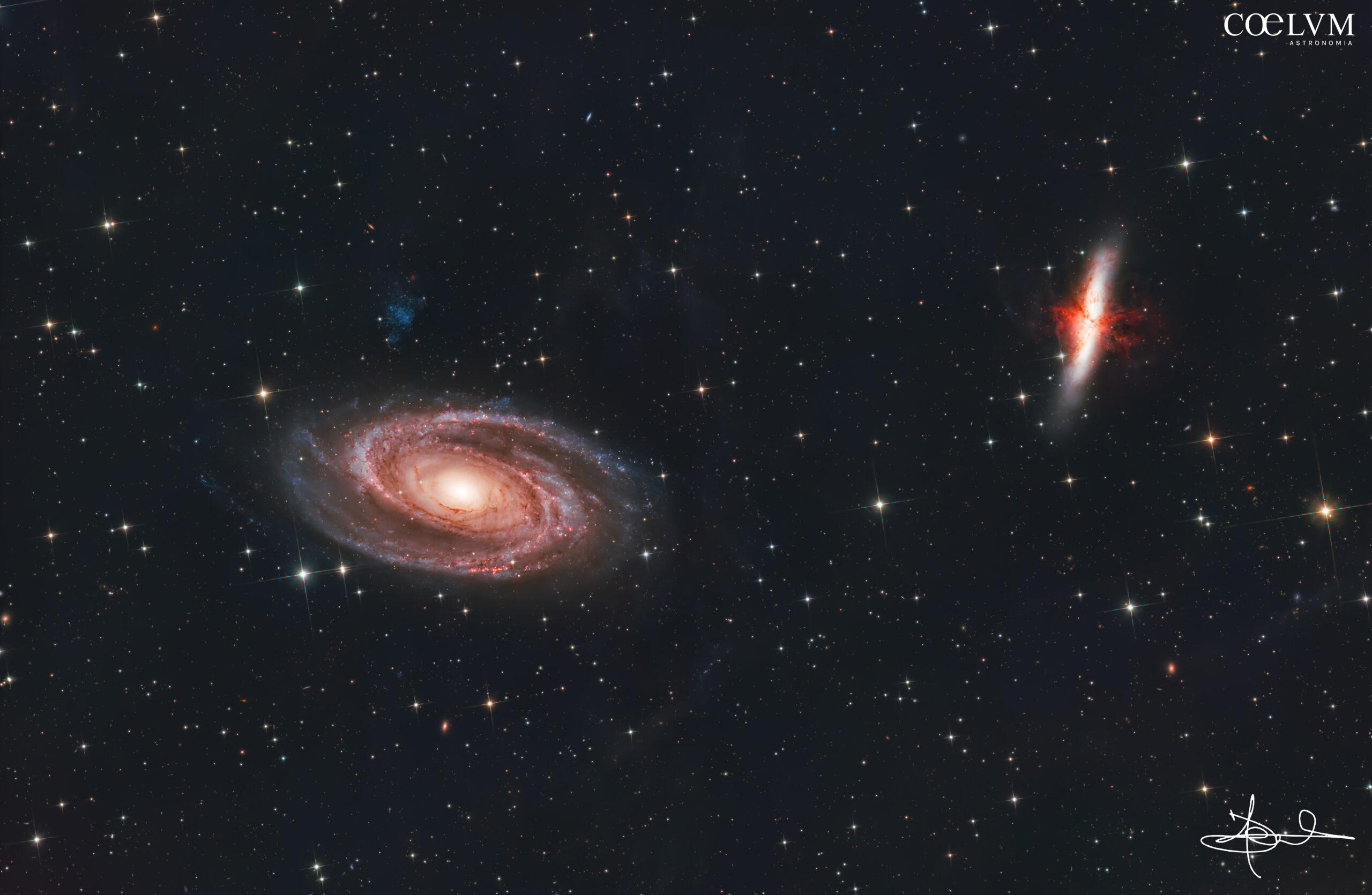 Nel cuore della costellazione dell’Orsa Maggiore, a circa 12 milioni di anni luce dalla Terra, danzano due galassie legate da antichi scontri gravitazionali. M81, elegante spirale, si mostra con bracci ordinati e un nucleo luminoso che racconta miliardi di anni di storia stellare. M82, la Galassia Sigaro, è il suo opposto turbolento: una fucina di stelle in formazione, attraversata da getti di gas e polveri che la rendono viva e inquieta. Insieme, formano una coppia cosmica che incanta astrofili e sognatori. @daniloskypix