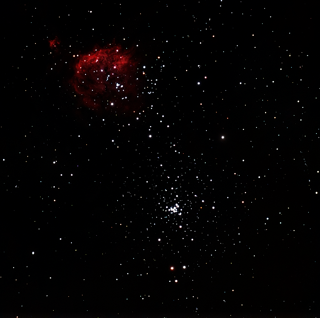 La mia “sfida” era di immortalare un campo stellare molto al disotto della mia latitudine (+42) e quindi “spingermi” a -41 come mostra questa foto. Questo scatto, è il migliore di tanti fatti e venuti malissimo. Ora le info: 22 anni fa, fotografai con corpo macchina reflex Yashica FX 3.S2000 collegata al fuoco diretto di un rifrattore Konus Vista 400mm di focale f/5 su inseguitore automatico Vixen con pulsantiera MD6, il tutto su robusto treppiede fotografico. Pellicola kodak 1600 iso e 11 minuti di esposizione senza correzione fuori asse. La stampa fu scannerizzata e digitalizzata in JPG con relativa elaborazione con PhotoScape, programma free on-line. La nebulosità rossa in alto è stata esasperata al colore rosso e poi sottratta di 4 step fino a mio piacimento, perchè sulla stampa originale era appena percettibile. Per le stelle ho utilizzato l’effetto “contorno” che le ha rese più nitide ed a fuoco, infine una leggera profondità e un lieve contrasto. Considerazioni: non è stato per niente facile ottenere questa immagine, se si considerando i mezzi di ripresa e tempo di esposizione abbastanza lungo per la focale utilizzata. Ricordo però ancora bene che riuscii a fare uno stazionamento molto preciso attenendomi alle istruzioni Vixen.