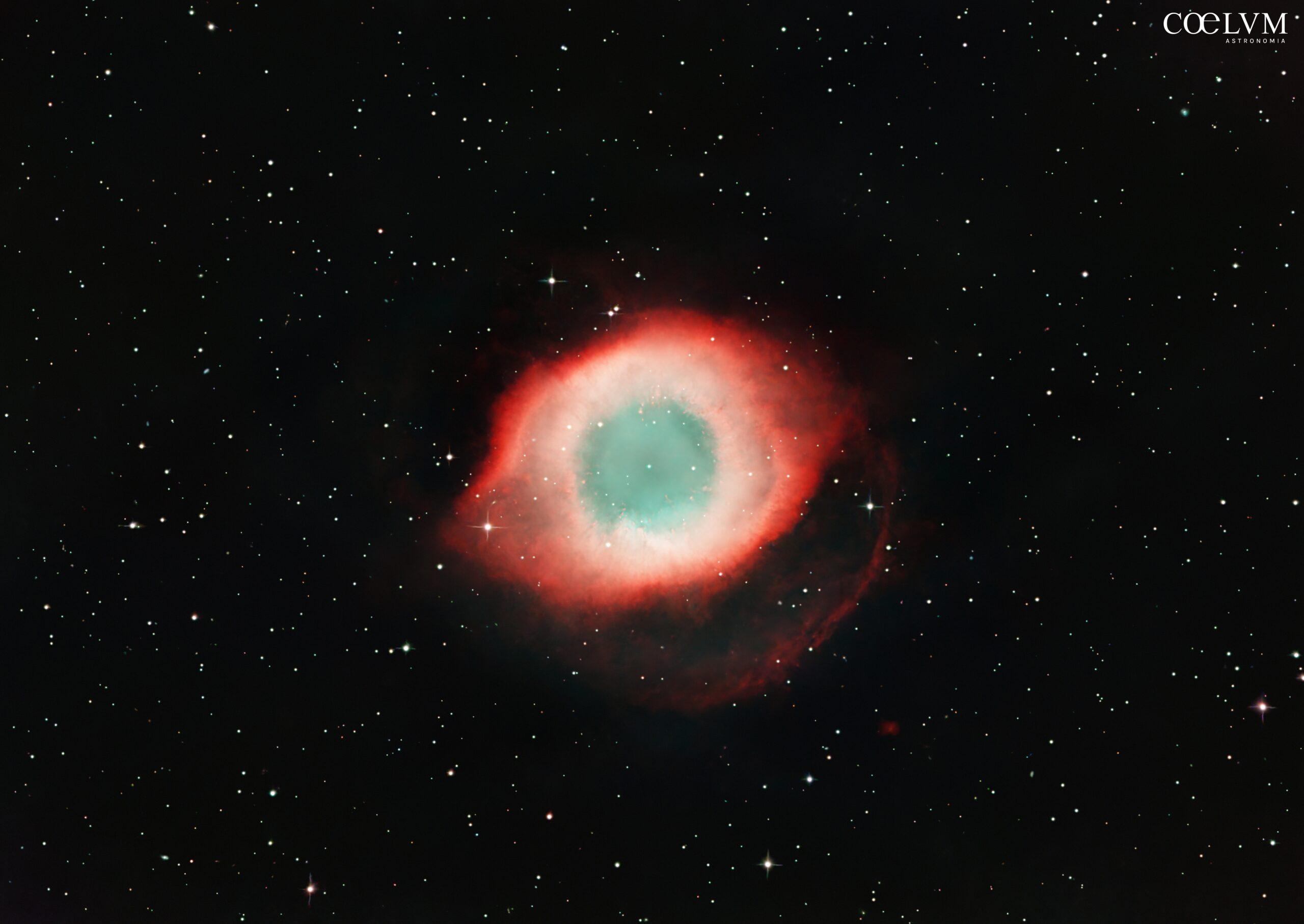 La Nebulosa Elica (NGC 7293) è una delle nebulose planetarie più vicine e studiate, situata a circa 650 anni luce dalla Terra nella costellazione dell’Acquario. Per la sua forma e i suoi colori, è spesso soprannominata l”Occhio di Dio’. Sebbene il nome “nebulosa planetaria” possa trarre in inganno, queste formazioni non hanno nulla a che fare con i pianeti. Il termine risale agli albori dell’astronomia strumentale, quando i primi telescopi le facevano apparire come dischi sfumati simili a pianeti. Si è formata circa 10.600 anni fa, quando una stella morente simile al nostro Sole ha espulso i suoi strati esterni nello spazio. Il risultato è questo meraviglioso anello di gas e polveri che si espande per circa 2,5 anni luce nello spazio. L’aspetto ad anello è un effetto della prospettiva, poiché gli strati più densi della nebulosa non si trovano al centro, ma ai suoi bordi. Il nucleo della stella originaria sta collassando per formare una nana bianca, una stella compatta e densa. Con una velocità di espansione di 31 km/s, la Nebulosa Elica è simile per dimensione, età e caratteristiche fisiche alla Nebulosa Manubrio Dal mio terrazzo a Formigine da dove ho fatto le foto, la Nebulosa Elica rappresenta un soggetto piuttosto difficile da fotografare perché si trova molto bassa sull’orizzonte, raggiungendo un’altezza massima di circa 25 gradi. Questa posizione rende la ripresa estremamente sensibile all’inquinamento luminoso proveniente dalla città e ai disturbi causati dai bassi strati dell’atmosfera, dove la turbolenza atmosferica e le particelle di polvere disperdono e alterano la luce, riducendo la nitidezza e il contrasto dell’immagine. Questo è il risultato 77 esposizioni da 300 secondi, per un totale 6 ore e 25 minuti complessivi.