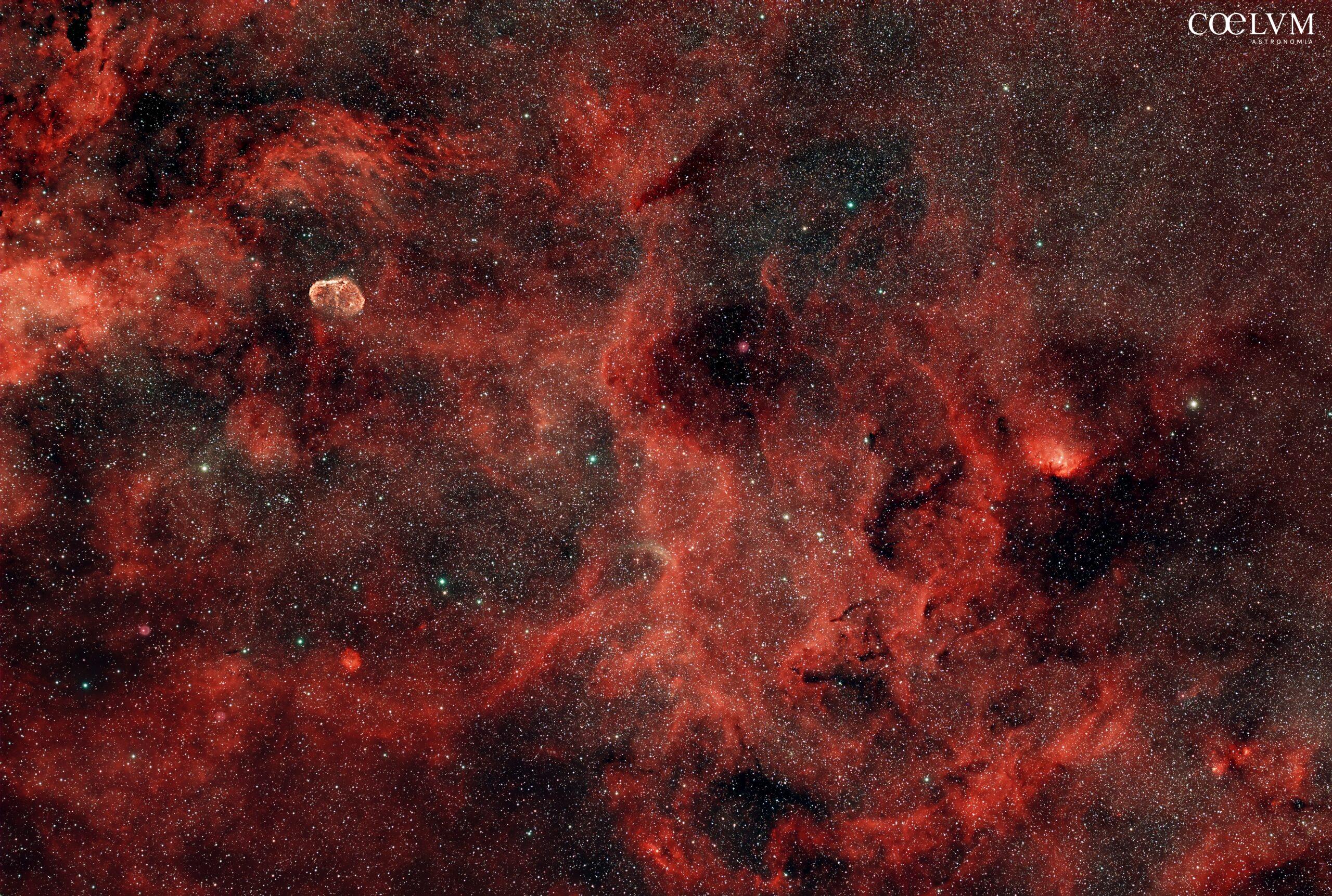 Questa foto cattura una vasta e affascinante porzione di cielo nella costellazione del Cigno. L’area visibile, grande circa come un pugno teso verso il cielo, punta direttamente verso uno dei bracci più densi della Via Lattea. L’immagine è il risultato di un’esposizione totale di oltre sei ore, un lavoro che ha permesso di rivelare dettagli altrimenti invisibili a occhio nudo. Lo scatto svela la ricchezza di questa regione, dominata da estese nubi di gas idrogeno, la cui intensa luce rossa (H-alfa) testimonia in alcuni casi l’attività di formazione stellare. L’immagine è un ricco arazzo di stelle, tutte appartenenti alla nostra galassia. Al suo interno spiccano oggetti notevoli come la Crescent Nebula (NGC 6888) e la Nebulosa Tulipano (Sh2-101). L’intera scena è impreziosita da miriadi di stelle di vari colori, che creano un affascinante contrasto con le nebulose. Quest’immagine è un potente promemoria del fatto che l’universo, anche in un’area apparentemente vuota, è un luogo incredibilmente dinamico e ricco di processi di creazione e trasformazione.