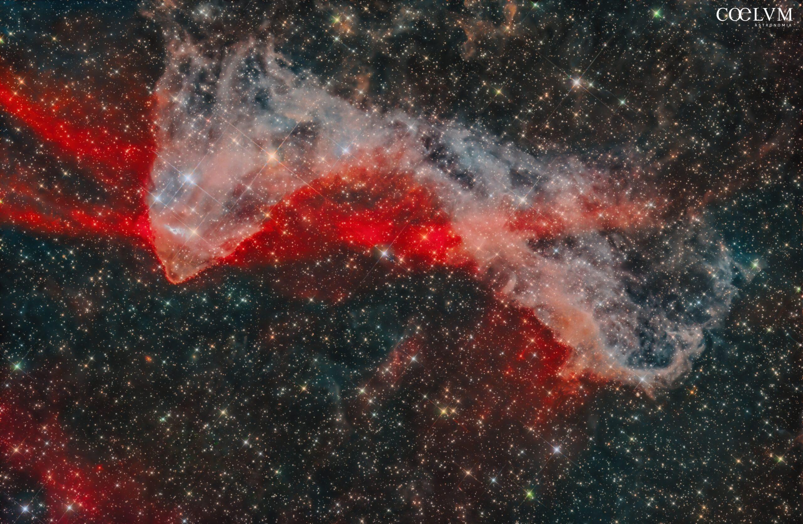 La nebulosa del geco è una nebulosa diffusa composta da gas ionizzati e polveri interstellari. La sua luminosità deriva dalla radiazione ultravioletta di stelle giovani, che eccita il gas producendo emissioni colorate. La forma irregolare, modellata da venti stellari e turbolenze, crea una sagoma che ricorda un geco immerso in un campo stellare. Setup: newton 200-800 f4 Asi2600mc Eq6r Asiair Correttore 4 lenti ed Ts L-pro 89 scatti da 300 sec gain 200 Photoshop, Siril, topaz.