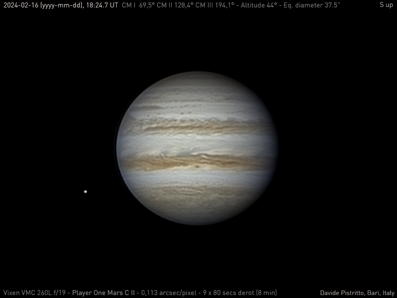 Nella grande giornata dell’esplosione di classe X da parte del Sole, ho avuto la fortuna di godere di buon seeing anche durante la serata, quando ho ripreso Giove alto 44° sull’orizzonte. La sua continua superficie mutevole, in questa occasione di mostra una grande attività nelle due bande principali e qualche accenno di festone sulla zona equatoriale.