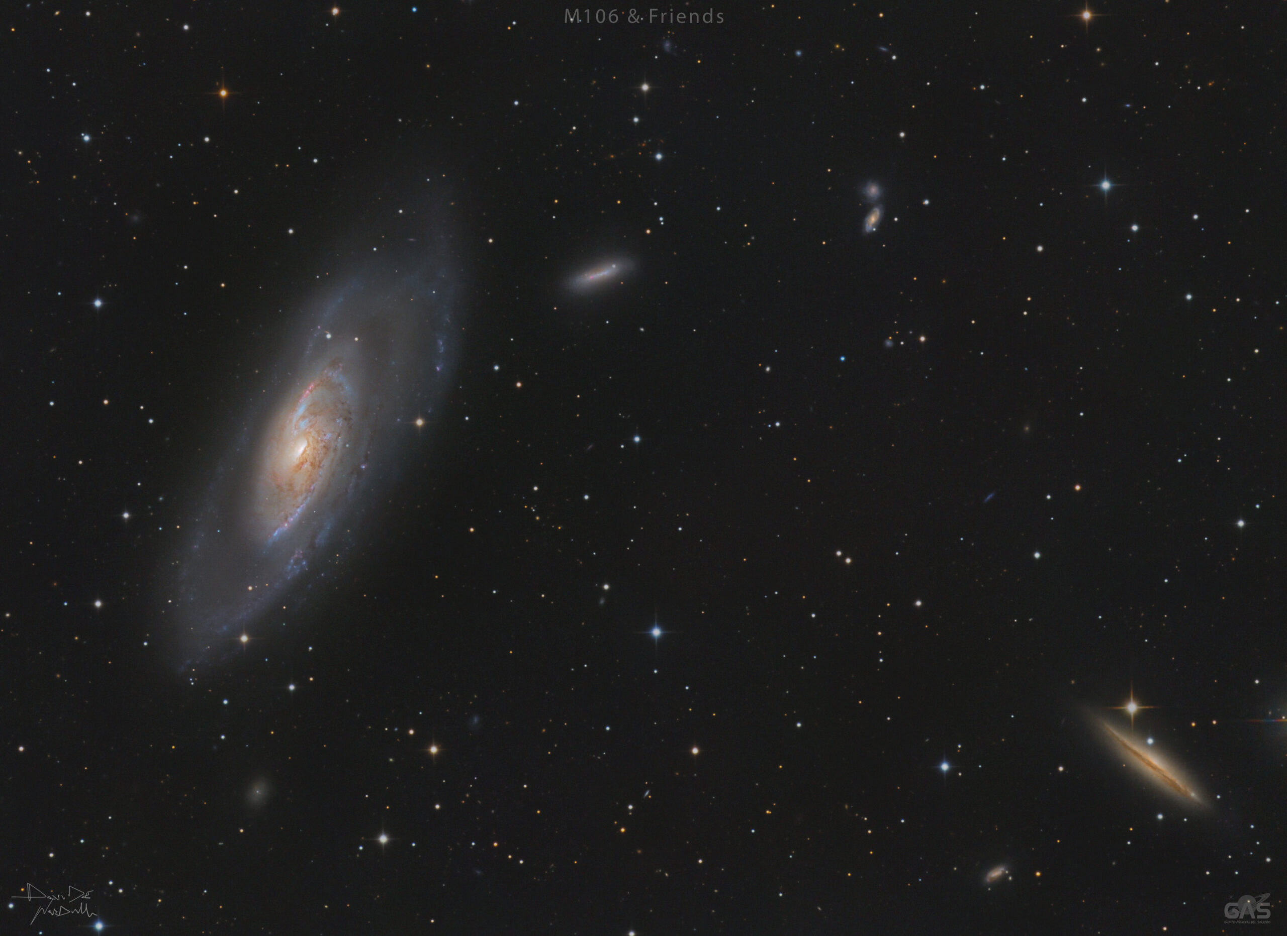 La stagione delle galassie continua e per diverse notti ho ripreso questo classico target primaverile ma sempre irresistibile per chi ama il cielo stellato e le sue meraviglie cosmiche , lei e’ M106 (conosciuta anche come NGC 4258) ed e’ una galassia a spirale visibile nella costellazione dei Cani da Caccia al cui interno sembra che ospiti un buco nero supermassiccio. M106 e’ in buona compagnia , infatti vi sono diverse galassie in questo ampio campo , in basso a destra la NGC4217 e accanto piu’ in basso la piccola NGC4226 , in alto proprio accanto alla M106 c’e’ la NGC4248 , piu’ a destra molto vicine tra loro le NGC4231 e NGC4232 . M106 fu scoperta da Pierre Méchain nel luglio del 1781 e la descrisse come un oggetto nebuloso posto fra l’Orsa Maggiore e i Cani Venatici. Charles Messier osservò quest’oggetto e le indicò la posizione, ma non lo inserì nel suo famoso catalogo poiché era già stato pubblicato, solo negli anni cinquanta del XX secolo questo catalogo fu esteso. Ho effettuato le riprese il 28 e 29 Aprile e il 4 , 5 e 6 Maggio per un totale di 22 ore con filtri a banda larga Optolong Astronomy Filter L-Pro e RGB.