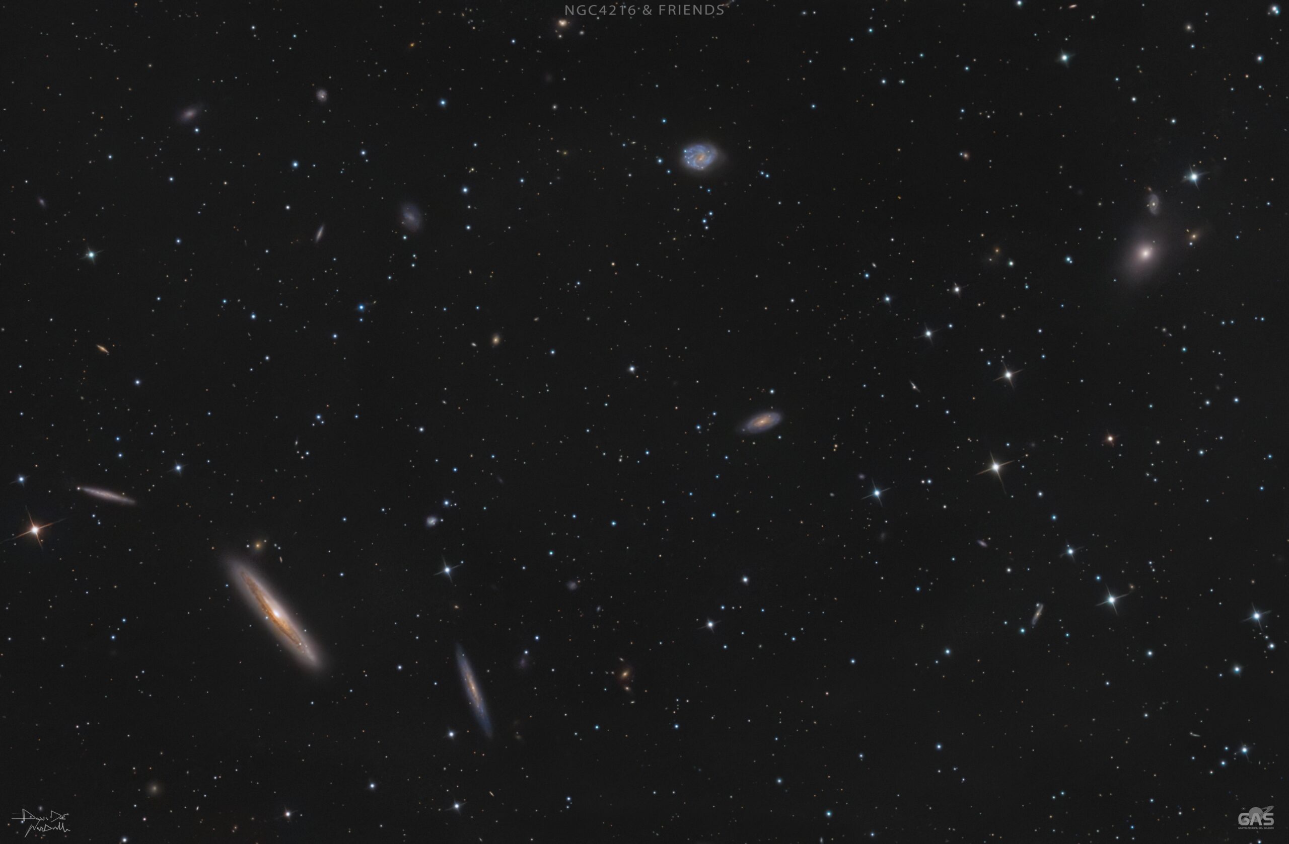 NGC4216 (in basso a sinistra) è una galassia a spirale intermedia ricca di metalli situata non lontano dal centro dell’Ammasso della Vergine, a circa 40 milioni di anni luce dalla Terra. NGC4216 e’ al centro del tripletto di galassie completato dalle galassie NGC4206 e NGC4222 , in questo ampio ammasso vi sono tante altre galassie tra cui le piu’ luminose sono : la spirale NGC4189 in alto al centro , la ellittica NGC4168 a destra e al centro del campo la NGC4193.Ho effettuato le riprese nelle notti dell’1 e 2 Aprile , 5 ore con il filtro Optolong L-Pro per il segnale di luminanza e altre 5 ore con i filtri Optolong RGB per il segnale colore.