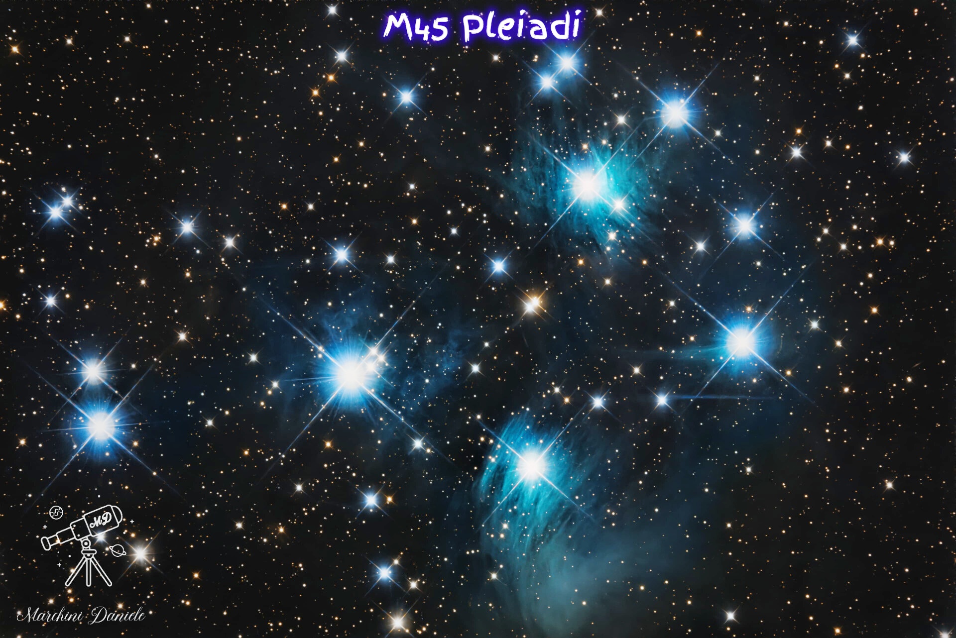 Una ripresa dell’ammasso aperto più celebre del cielo boreale, le Pleiadi, situato nella costellazione del Toro. L’immagine mette in risalto le calde stelle giganti blu circondate dalle caratteristiche nebulose a riflessione (come la Nebulosa di Merope). Nonostante la sessione sia stata effettuata con una Luna al 70%, sono state eseguiti 60 esposizioni da 1 minuti e 30 esposizioni da 2 minuti. Eseguita con Newton Truss 230/920 di Marco Guidi , Camera Poseidon C-PRO Player one. Processata con Pixinsight