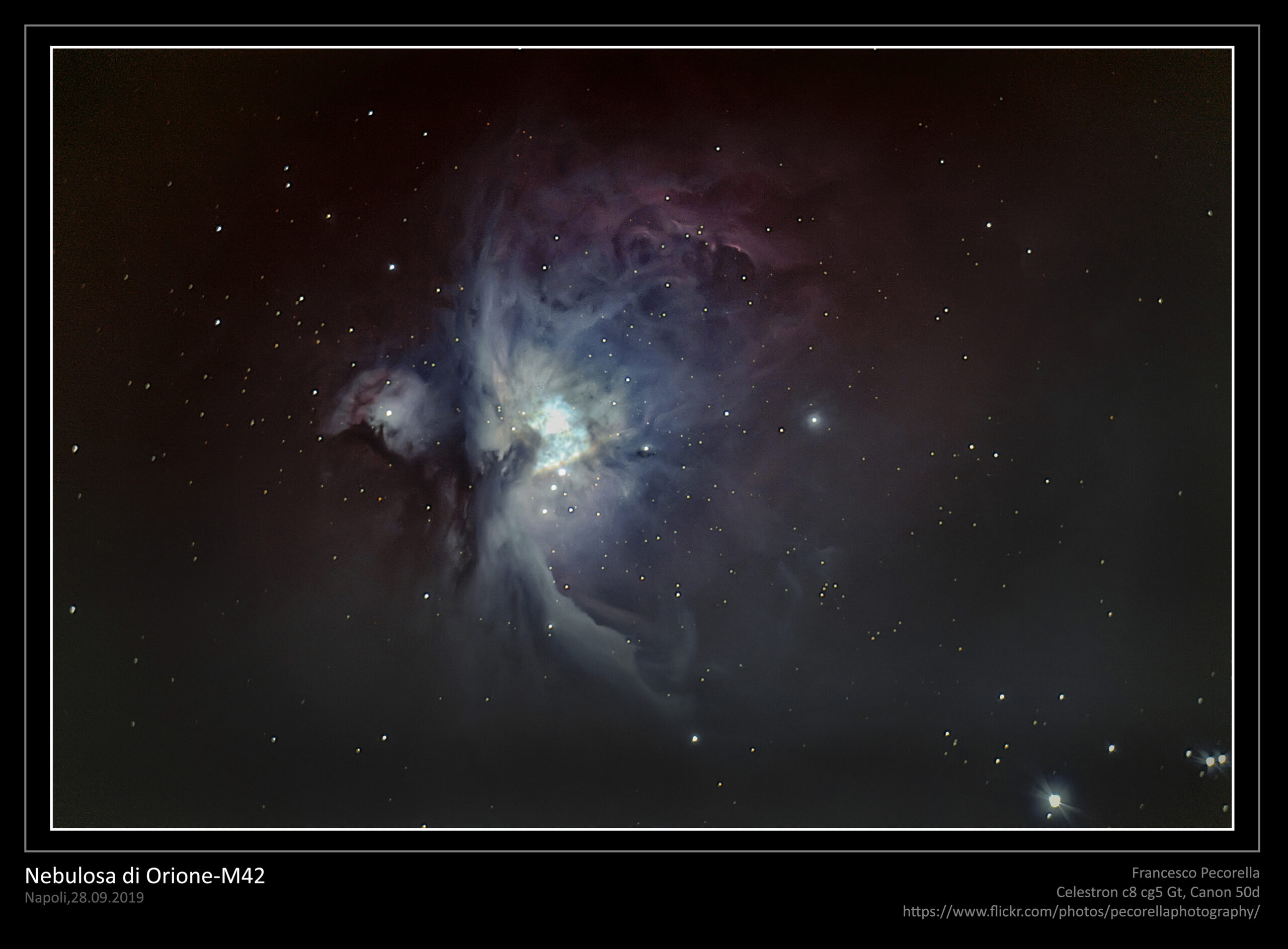 Si vedono molte foto della M42 ma questa è la prima del 2019 fatta da me e dal cielo inquinato di Napoli città. Quasi 1 ora di posa con dark,flat e bias eseguiti con reflex Canon50d su C8, Cg5Gt. Elaborata con Dss e photoshop.
