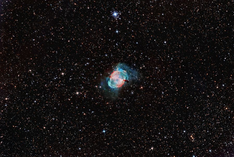 M27 conosciuta anche come Nebulosa Manubrio, è una nebulosa planetaria individuabile nella costellazione della Volpetta, Dista dal nostro sistema solare circa 1300 anni luce . Fu scoperta il 12 luglio del 1764 da Charles Messier, ed è stata la prima nebulosa planetaria ad essere individuata. In M27, la massa della nana bianca al centro della nebulosa è stata stimata a poco più della metà di quella solare, pur avendo un raggio 0,055 più piccolo