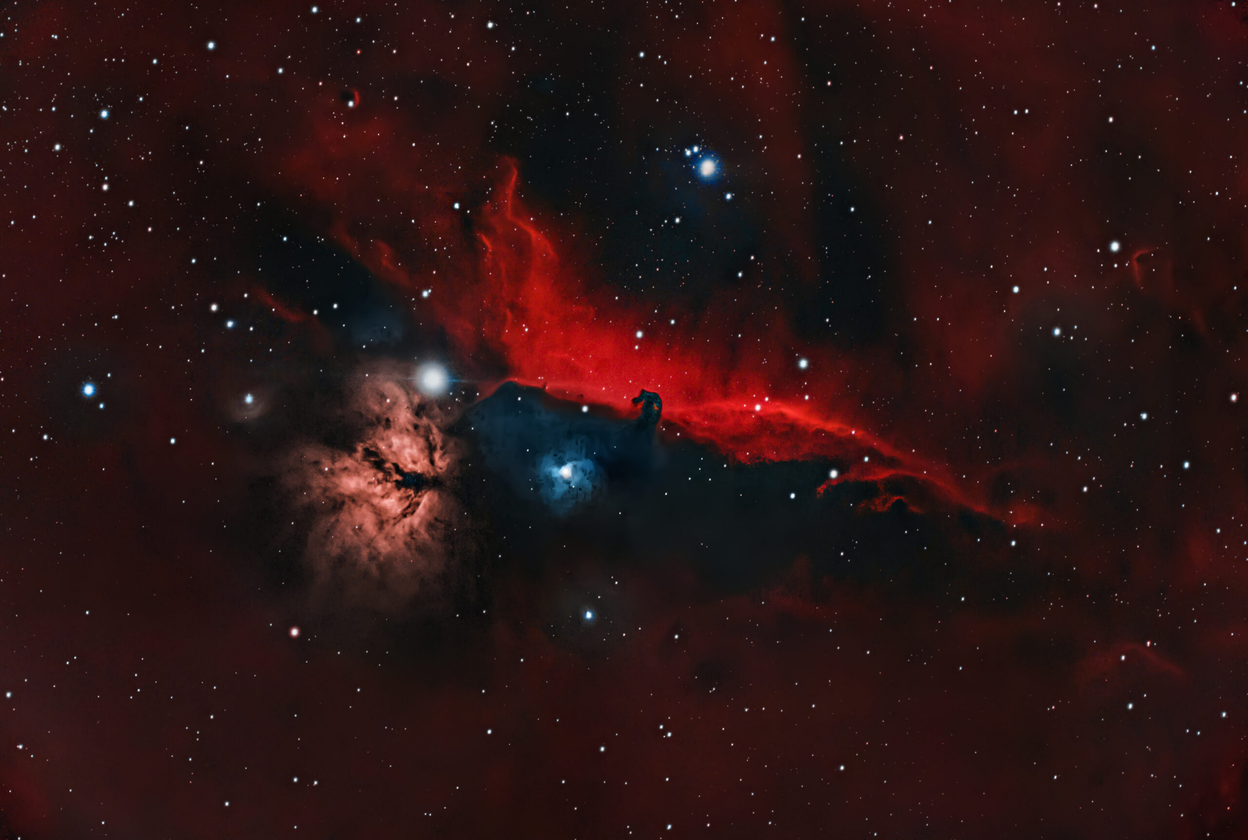 La stella Alnitak illumina una delle zone più belle del cielo invernale, quello che comprende la nebulosa Fiamma Ngc2024, la Testa di Cavallo B33 con la nebulosa Ic434 alle sue spalle. La Testa di Cavallo è sicuramente quella più ammirata e fotografata, e dista circa 1.500 anni luce dalla Terra. Queste nebulose si trovano proprio sotto la famosa Cintura di Orione, nell’omonima costellazione. La foto è stata eseguita da Milano con cielo bortle 8.4, circa 15 ore di esposizione con scatti da 180 e 300 secondi