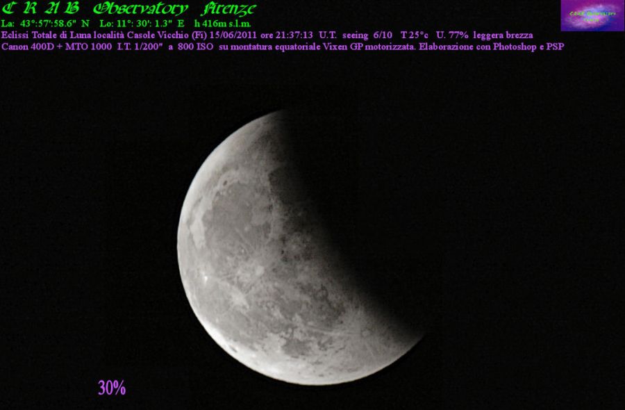 La Luna ripresa da Casole Vicchio (Fi) poco dopo la metà dell’eclisse con una Canon 400D al F.D. di un MTO 1000 su montatura Vixen GP motorizata I.T. 1/200" a 800 ISO. Elaborazione con Photoshop e PSP