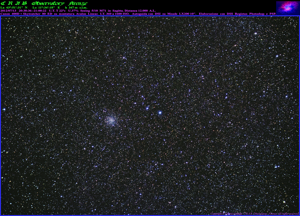Ammasso globulare M71 in Sagitta ripreso da Londa ( Fi ) Canon 400D + Skywatcher 80 ED su montatura Avalon Linear. 2 pose da 360" a 1600 ISO. Aurtoguida com Meade LX200 10" e DSI. Elaborazione con DSS, Registax, Photoshop e PSP