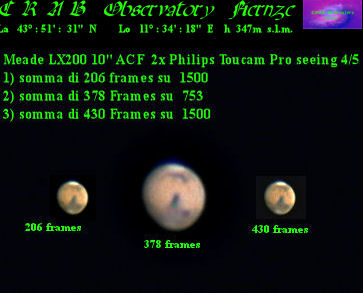 Marte ripreso con una Philips Toucam Pro e duplicatore di focale al fuoco di un Meade LX200 10″ ACF. Condizioni del cielo quasi disastrose. Elaborazione con Registax e Photoshop