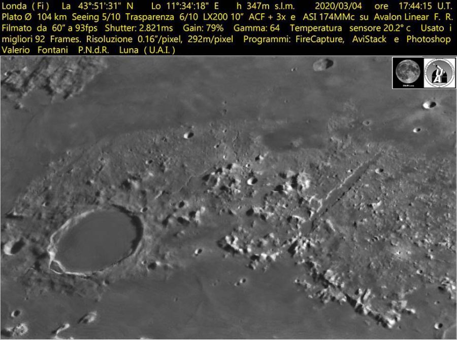 Cratere Plato Ø 104 Km e la Vallis Alpes Immensa faglia orientata nella direzione Sud-Ovest Nord-Est. Alte scarpate su ciascun lato. Sul fondo un solco rettilineo di 700 m di larghezza.