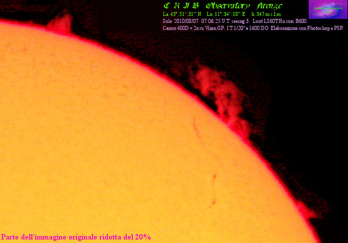 Protuberanze solari riprese da Londa (Fi). Protuberanze solari riprese da Londa con Lunt 60LS60T Ha e canon 400D. Elaborazione con Photoshop e PSP. Immagine ridotta del 20%