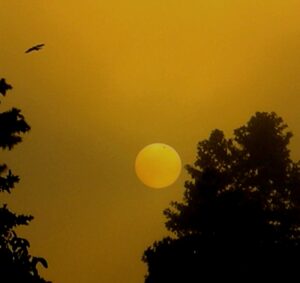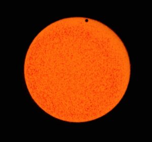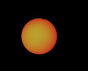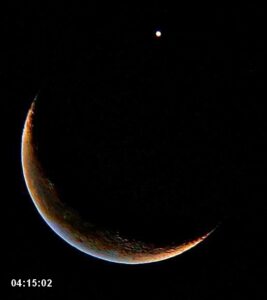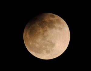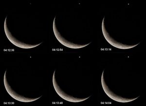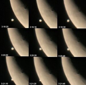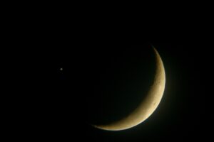 Occultazione lunare di Giove. L’immagine ritrae la fase d’Immesrione. Unico scatto con reflex Canon 350D applicata ad un riflettore da 120 mm in proiezione di oculare ( oculare da 25 mm più Barlow 3X). Difficoltà di messa a fuoco a causa della foschia, dell’enorme turbolenza e dei 7° di declinazione.