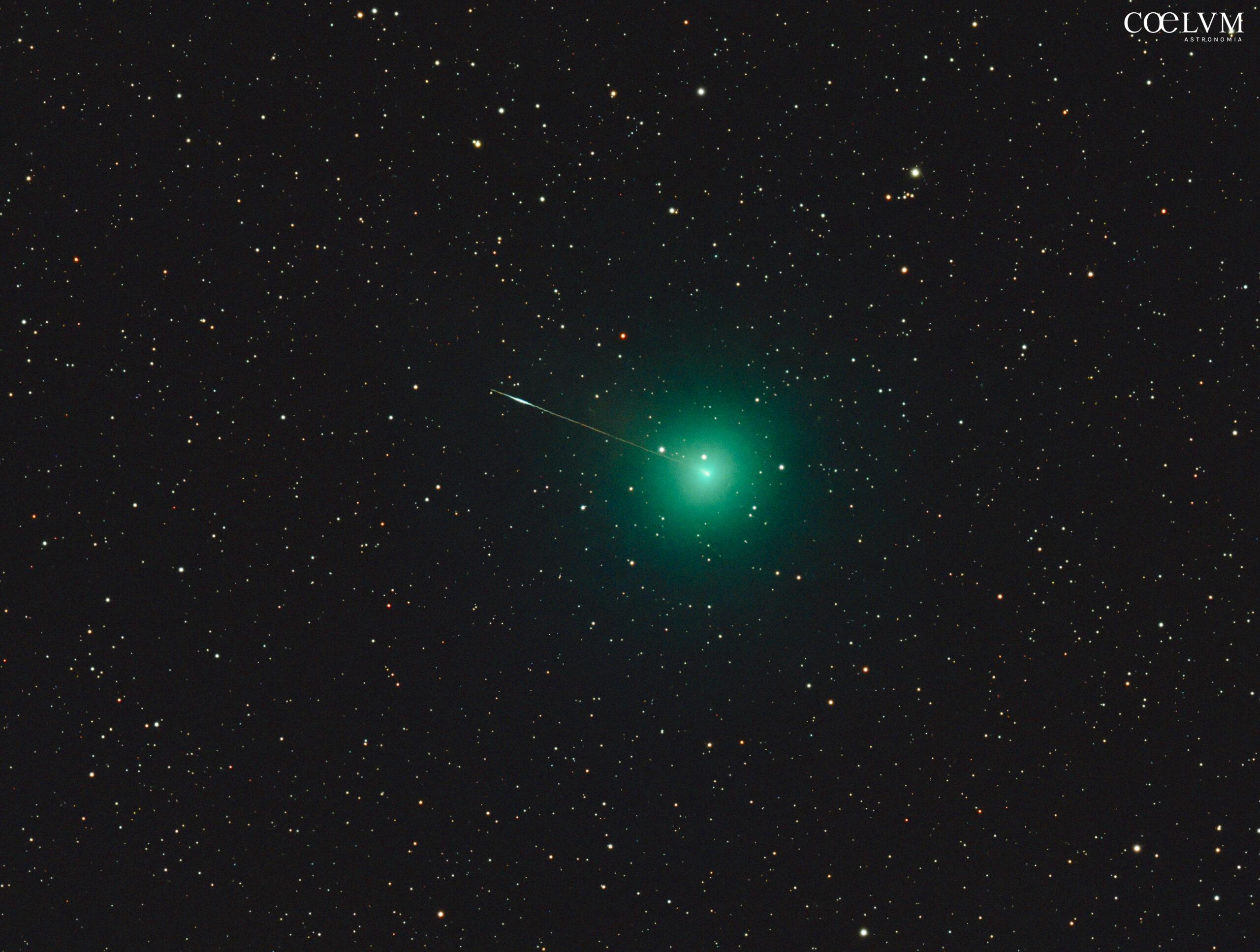 C/2025 R2 Swan con coda “artificiale”. Forse una meteora o la traccia di un satellite. Scatto singolo di 60 s. Skywatcher 82ED, spianatore di campo, camera Asi 2600MC, filtro UHC Optolong, HEQ5; AsiAir, EAF; Software: Pixinsight e Lightroom; Cava D’Aliga, Scicli, Sicilia, 24 ottobre 2025, h 22:12:31