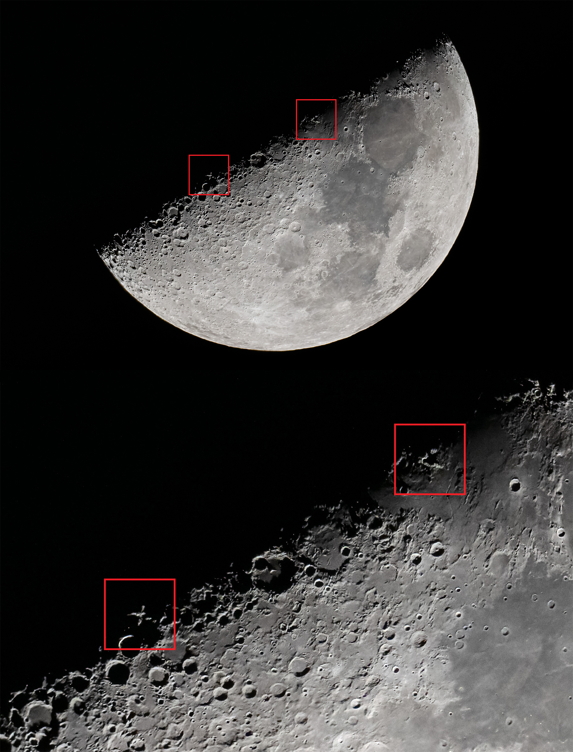 Lunar X e V (dopo il primo quarto) Sulla Luna, in corrispondenza del terminatore (la linea che separa la parte illuminata da quella in ombra), è possibile vedere chiaramente una X. Questo fenomeno si verifica quando la luce solare arriva a lambire le parti più elevate dei crateri La Caille, Blanchinus e Purbach. Solitamente si può ammirare per alcune ore, prima che la Luna raggiunga il primo quarto, ma in alcune occasioni (come in questa) e in seguito alla librazione lunare, si può verificare dopo. In concomitanza di questo fenomeno, e possibile inoltre notare, spostando lo sguardo lungo il terminatore, una V (il Lunar V). La V si forma poiché la luce illumina il cratere Ukert. Dati dell’immagine: Schmidt-Cassegrain Celestron 6 pollici, mirrorless Nikon utilizzata con la tecnica del fuoco diretto, lunghezza focale 1500mm, Iso 2800, f/10, exp. 1/800s. Scicli, 25 marzo 2026, h 22:29 (UTC h 21:29); Il primo quarto si è verificato alle 20:17 ora italiana (UTC h 19:17) Software: Pixinsight e Lightroom