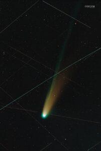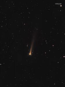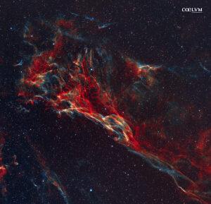 Nebulosa Velo Occidentale (NGC 6960), visibile nella costellazione del Cigno. La Nebulosa Velo, il cui nome deriva dalla sua struttura filamentosa, è conosciuta anche come “Nebulosa Rete”, “Velo da sposa” o “Scopa di strega”, ed è un antico resto di supernova. La stella che ha originato questo spettacolo è esplosa migliaia di anni fa ed espandendosi verso l’esterno ha formato le strutture distintive della nebulosa. Gli esperti ritengono che avesse una massa pari a 20 volte quella del Sole e che si trovasse a 2.100 anni luce dalla Terra, nella costellazione del Cigno. Questi meravigliosi colori sono stati generati dalle variazioni di temperatura e densità degli elementi chimici presenti nella nebulosa. Notiamo, in primis, il rosso dato dall’idrogeno ionizzato, e il blu dell’ossigeno. Dati dell’immagine: Skywatcher 82ED, spianatore di campo, camera Asi 2600MC, filtro UHC, HEQ5; AsiAir, EAF; light 343x180s., bias, flat e dark; Software: solo Pixinsight. Scicli, dal 23 al 28 agosto 2025 Software: Pixinsight e Lightroom.