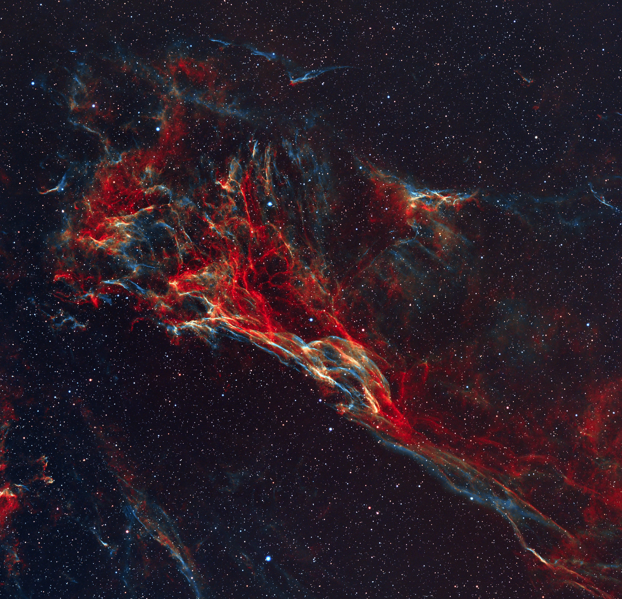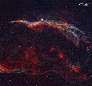 Triangolo di Pickering (NGC 6979), visibile nella costellazione del Cigno. La Nebulosa Velo, il cui nome deriva dalla sua struttura filamentosa, è un antico resto di supernova. La stella che ha originato questo spettacolo è esplosa migliaia di anni fa ed espandendosi verso l’esterno ha formato le strutture distintive della nebulosa. Gli esperti ritengono che avesse una massa pari a 20 volte quella del Sole e che si trovasse a 2.100 anni luce dalla Terra, nella costellazione del Cigno. Questi meravigliosi colori sono stati generati dalle variazioni di temperatura e densità degli elementi chimici presenti nella nebulosa. Notiamo, in primis, il rosso dato dall’idrogeno ionizzato, e il blu dell’ossigeno. Il Triangolo di Pickering, che rappresenta una sezione della nebulosa Velo, prende il nome del direttore dell’Harvard College Observatory. A onor del vero, i suoi deboli filamenti furono scoperti da Williamina Fleming. Dati dell’immagine: Skywatcher 82ED, field flattener, camera Asi 2600MC, filtro UHC, HEQ5; AsiAir, EAF; light 343x180s., bias, flat e dark; Software: Pixinsight e Lightroom. Scicli, dal 23 al 28 agosto 2025
