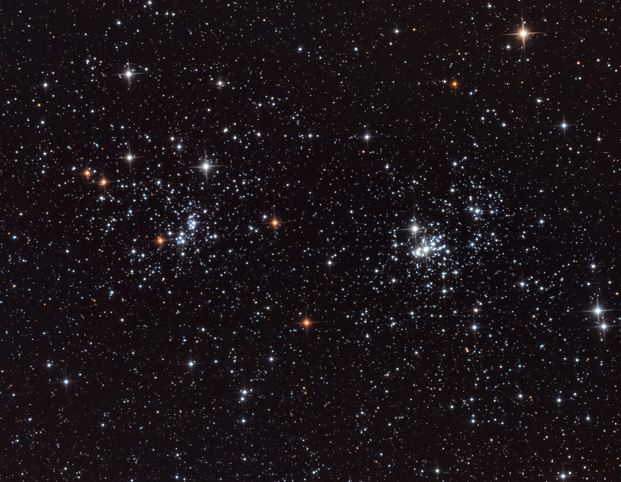 l corpo celeste in foto non è altro che un insieme di due ammassi h e χ Per nella costellazione del Perseo, distanti tra di loro 800 anni luce e con una dimensione di 140 anni luce l’uno. Si tratta di un insieme di stelle non estremamente denso come gli ammassi globulari, ma comunque molto luminoso, difatti in città è possibile vederlo con un binocolo e sotto un cielo poco inquinato anche ad occhio nudo. Gli scatti sono stati ottenuti con un telescopio Newtoniano 150/750 e una Canon Eos 1300d modificata.