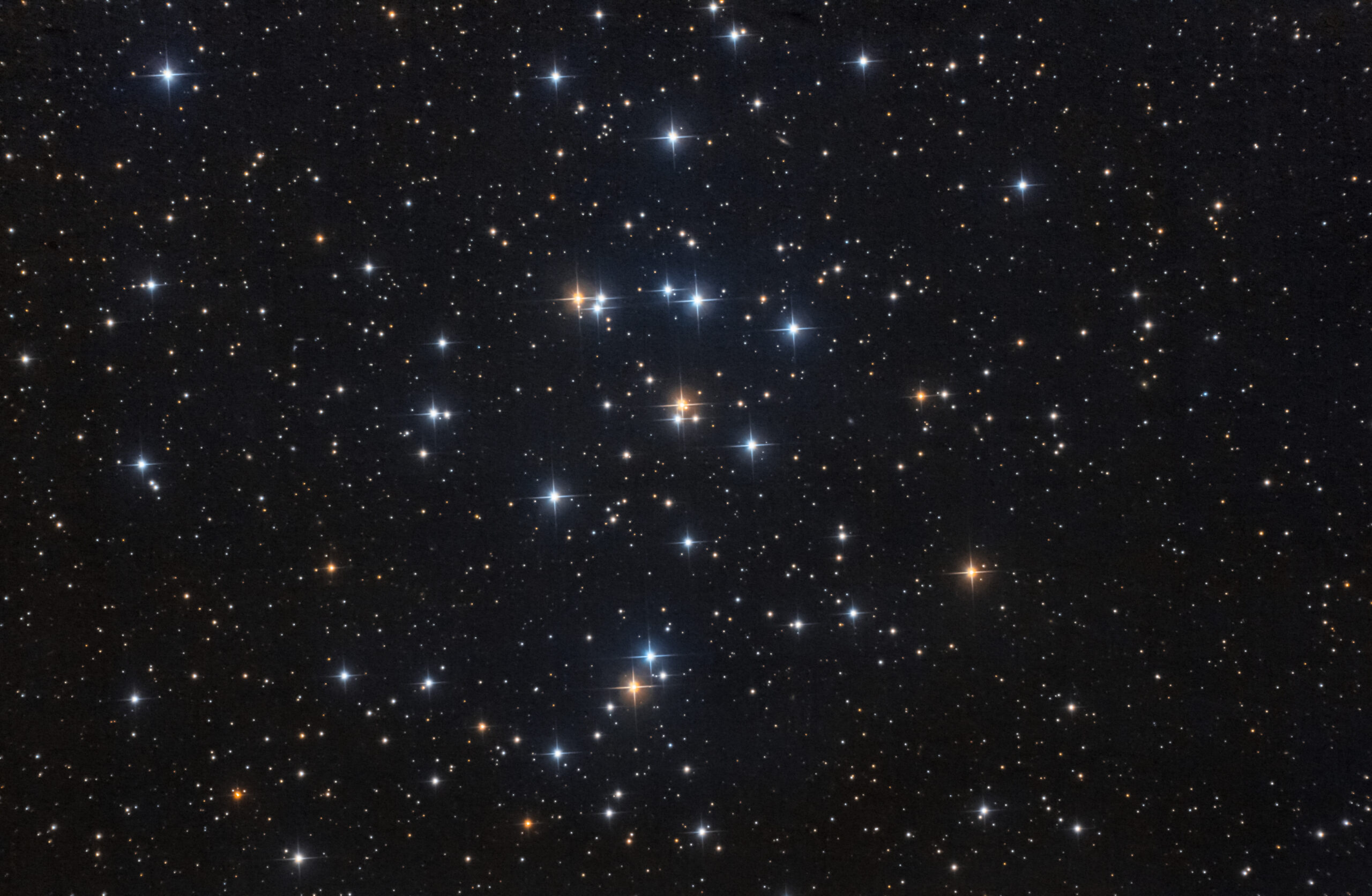 M44, noto con i nomi di ammasso del Presepe è un brillante ammasso aperto visibile nella costellazione del Cancro. Visibile ad occhio nudo sotto un cielo buio, contiene almeno un migliaio di stelle legate gravitazionalmente, per una massa totale di circa 500-600 masse solari. Le riprese sono state fatte da Palermo, integrando 200 scatti da 90 secondi.