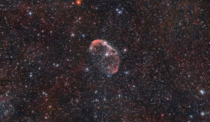 NGC 6888, nota anche come Nebulosa crescente, è un resto di supernova visibile nella parte meridionale della costellazione del Cigno. La nube risplende per riflessione, a seguito dell’energia ricevuta durante l’esplosione della stessa supernova Nel giro di pochi millenni si prevede che l’oggetto svanirà del tutto, disperdendosi nel mezzo interstellare. L’immagine risultate è stata ottenuta tramite una combinazione dei canali H-alpha, RGB e O3 in LHRGBO.