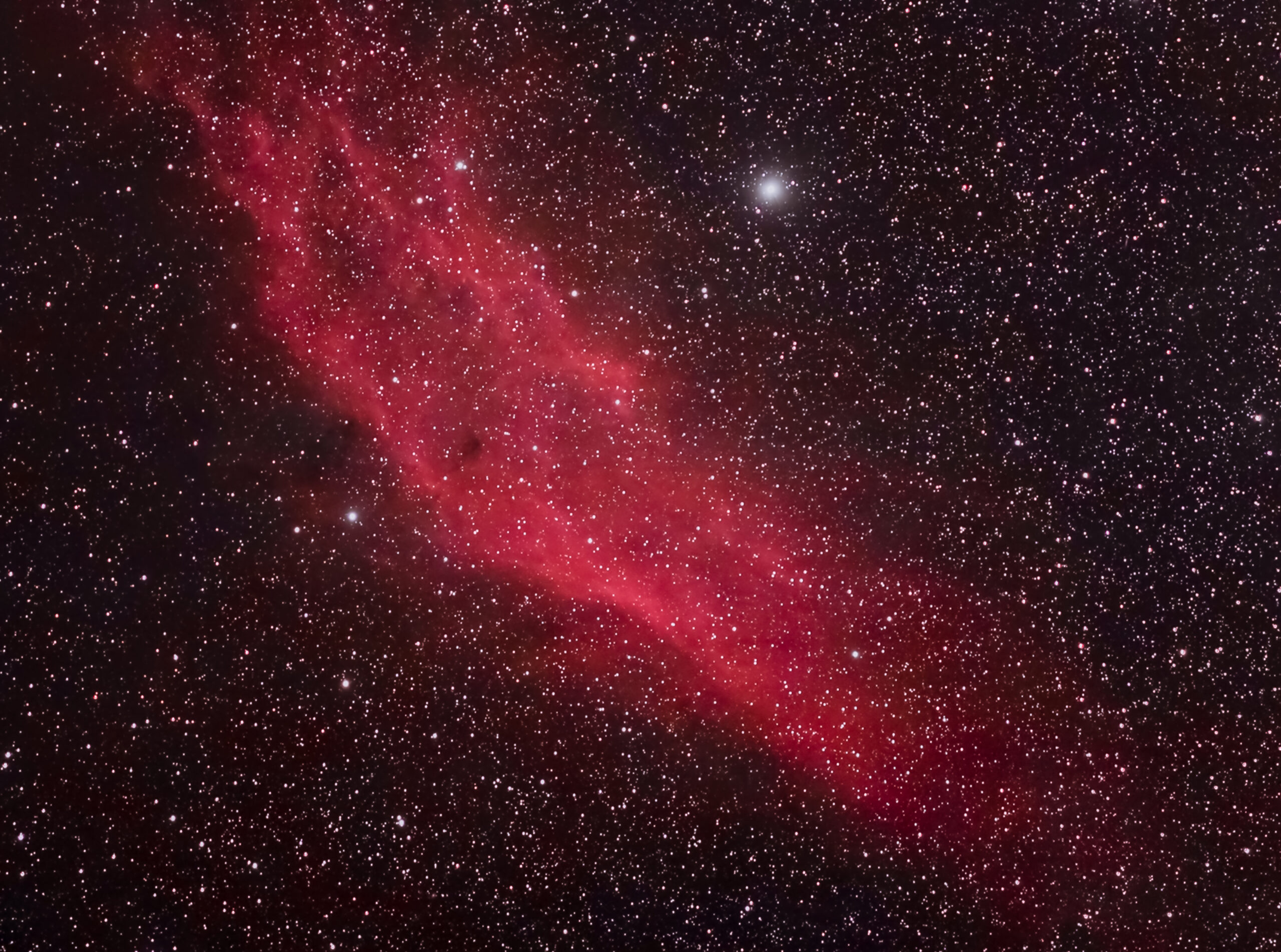 Primo tentativo a campo largo per la nebulosa California: regione H-II nella costellazione del Perseo. Si tratta di una nube interstellare di gas ionizzato, che emette nella specifica riga dell’H-alpha (656,3 nm).