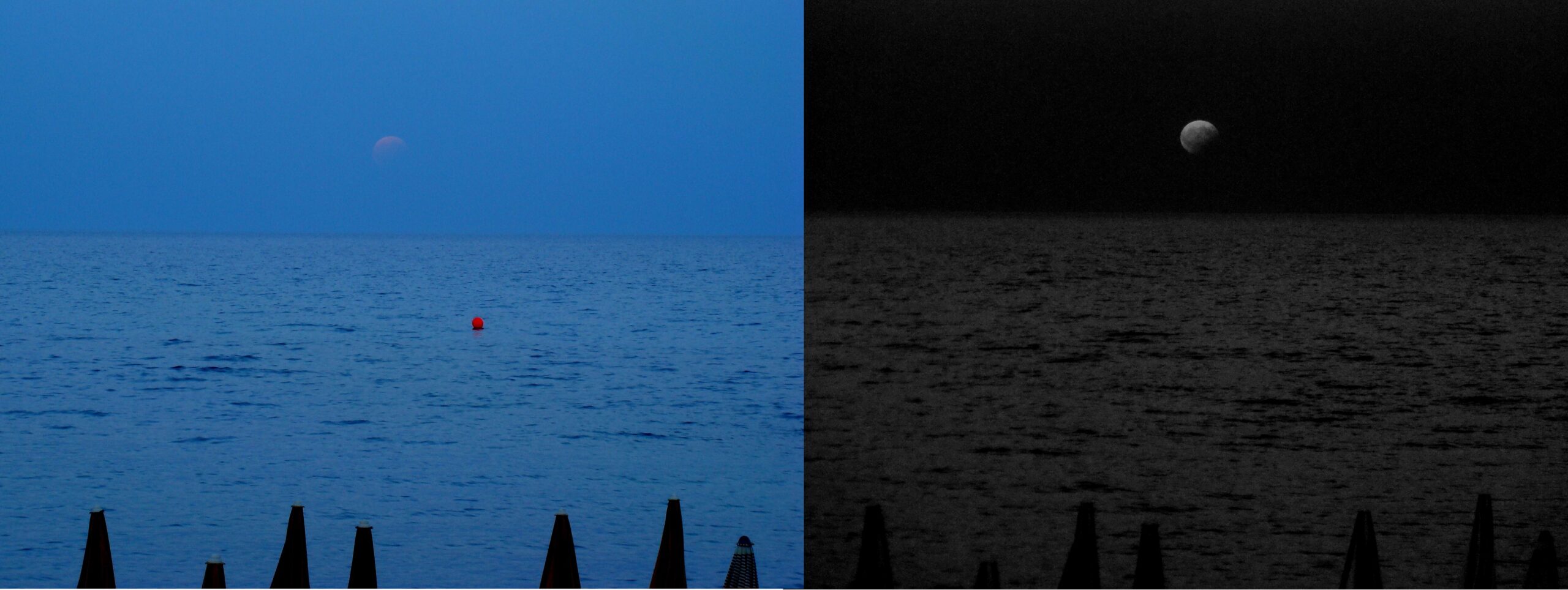 Eclisse di Luna del 7 agosto 2017, ripresa al momento del sorgere del satellite nel visibile (la luna si intravvede appena a causa dell’assorbimento atmosferico) e nell’infrarosso (oltre 700nm). La ripresa e’ stata effettuata dalla passeggiata a mare di Loano, nello stesso istante e con focale approssimativamente uguale. L’immagine nel visibile e’ stata acquisita con una Sony DSC-H7 (80 ISO, 1/6 sec) mentre quella nell’infrarosso con una Olympus SZ-10 modificata con filtro IR (ISO 800, 1/40 sec).