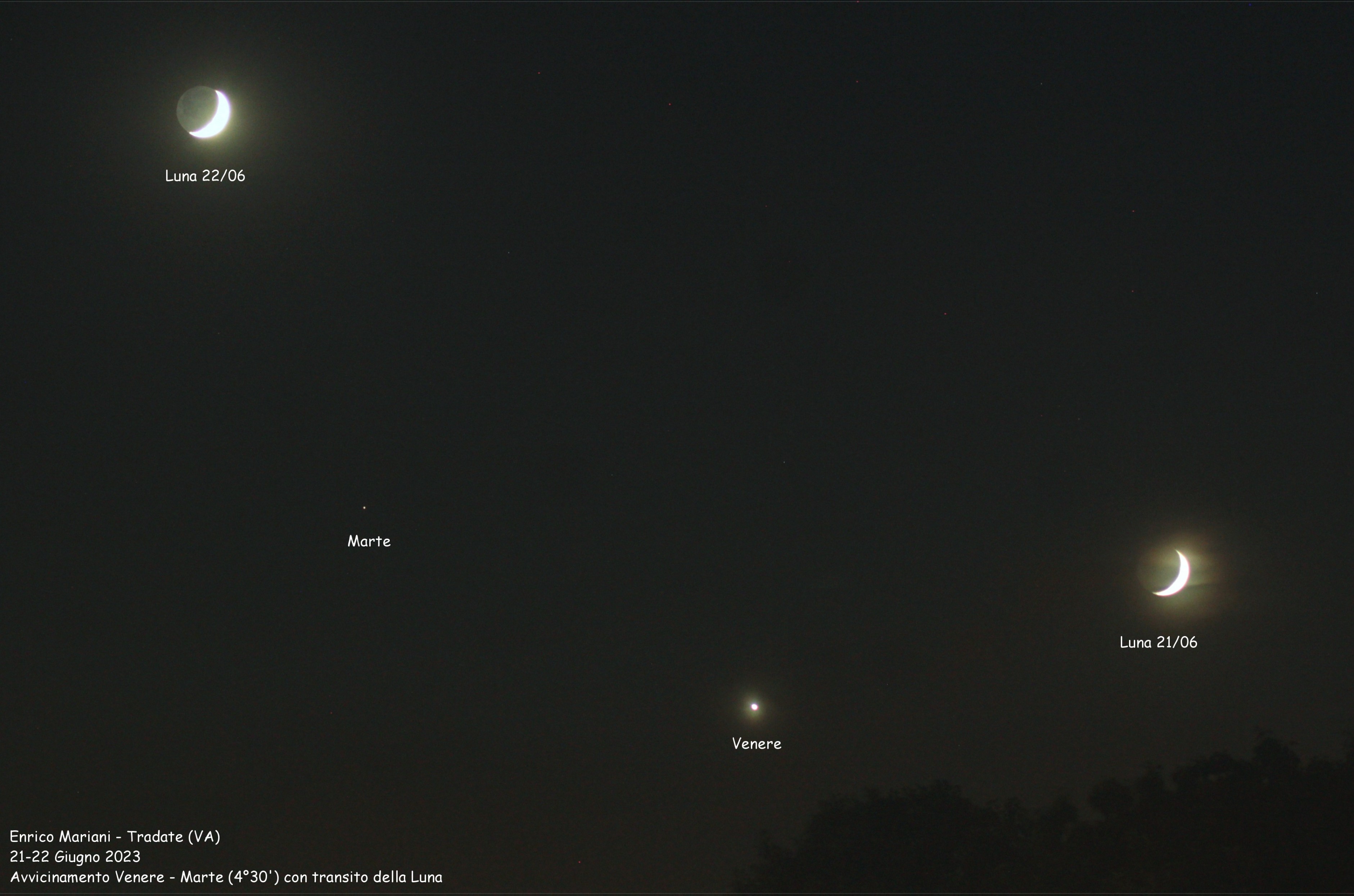 La foto è la media di due riprese fatte il giorno 21/06 alle 20:58(U.T.) e il 22/06 alle 20:37(U.T.) che mette in mostra i due satelliti e il transito della Luna
