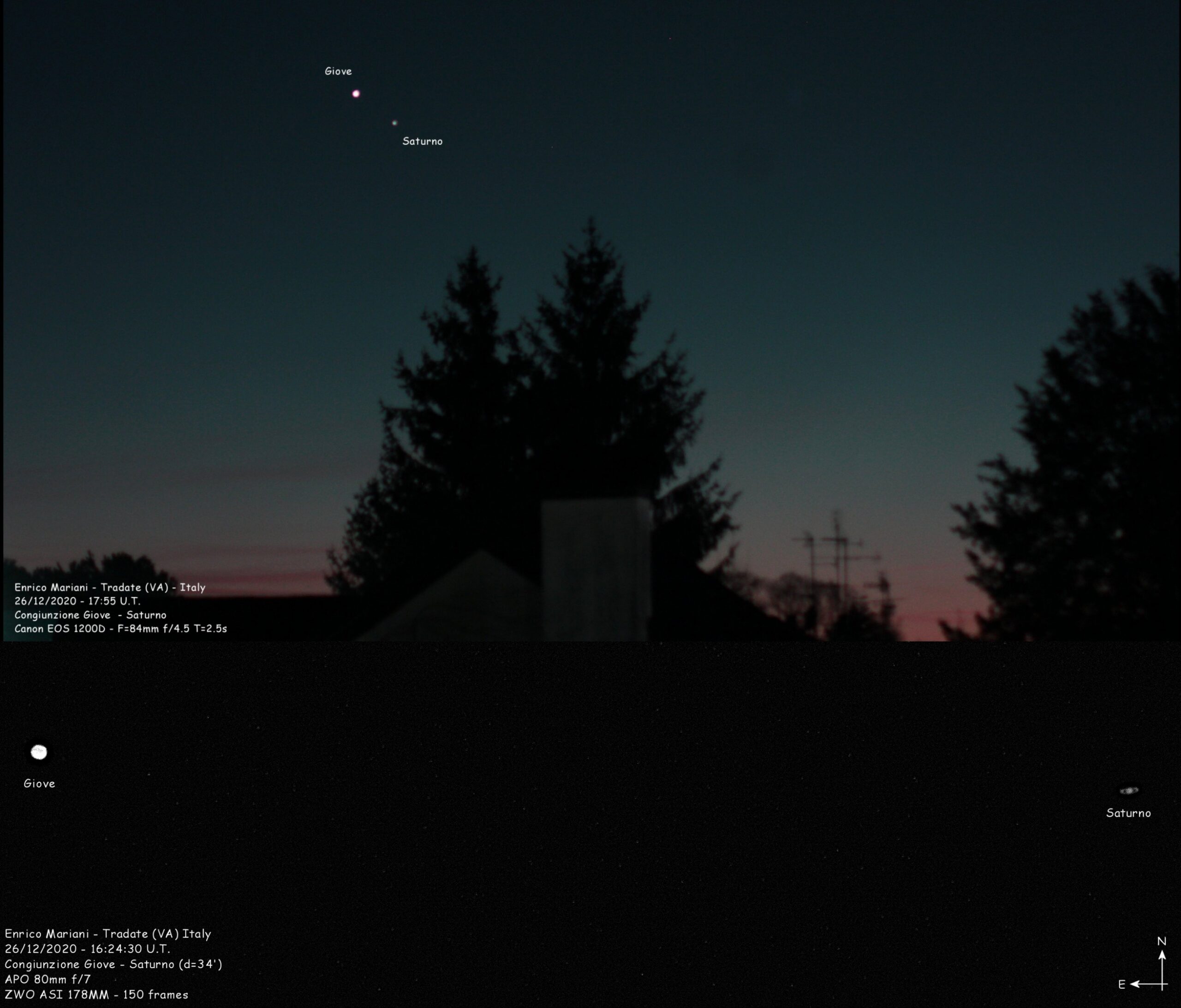 Foto della congiunzione tra Giove e Saturno fatta purtroppo 5 giorni dopo a causa delle avverse condizioni di tempo. La foto è formata da una ripresea fatta con Canon EOS 1200D e quella inferiore da un filmato ripreso al fuoco diretto di un rifrattore APO 80mm