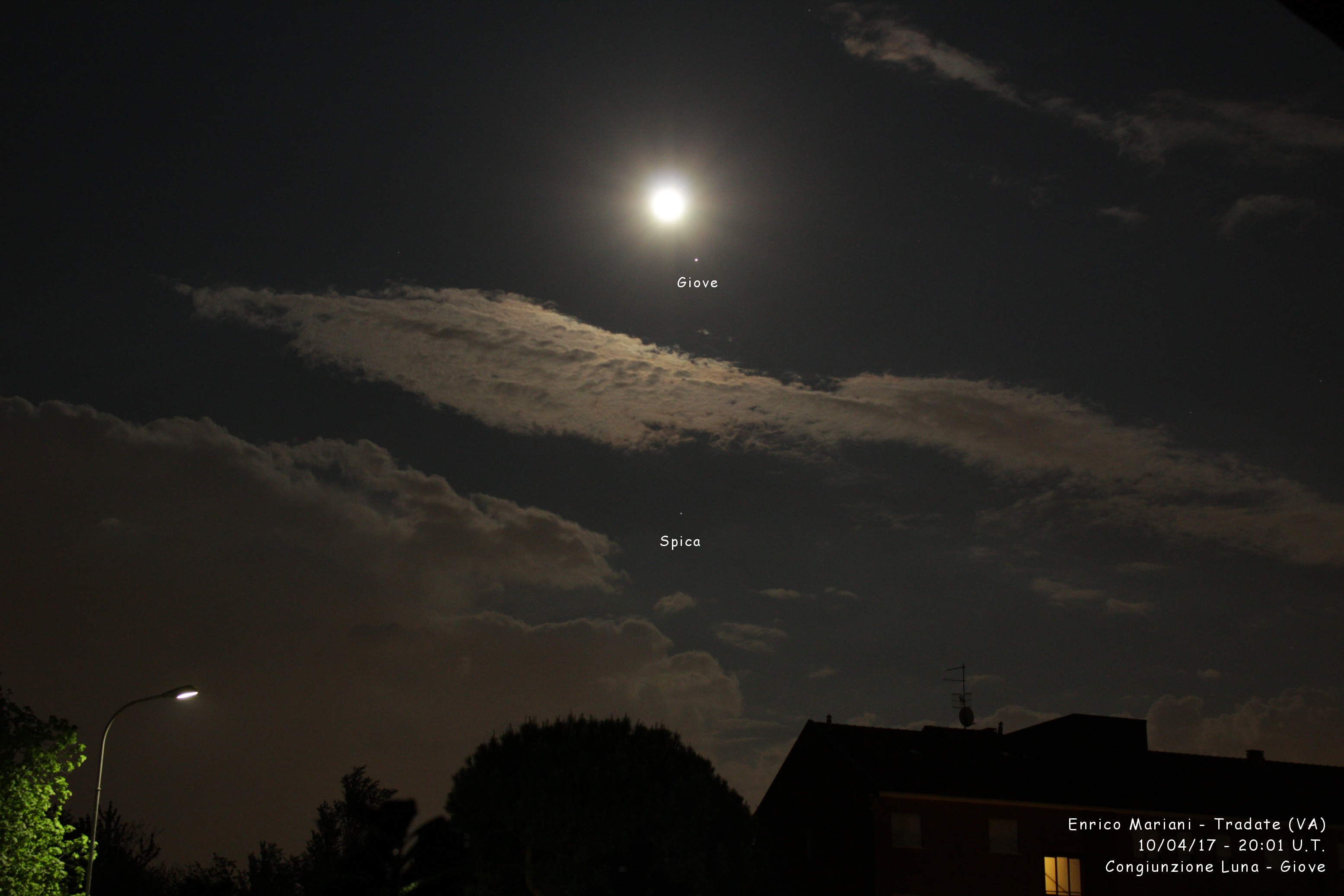 Congiunzione Luna – Giove con a Sud la stella Spica. La fase della Luna è del 99%
