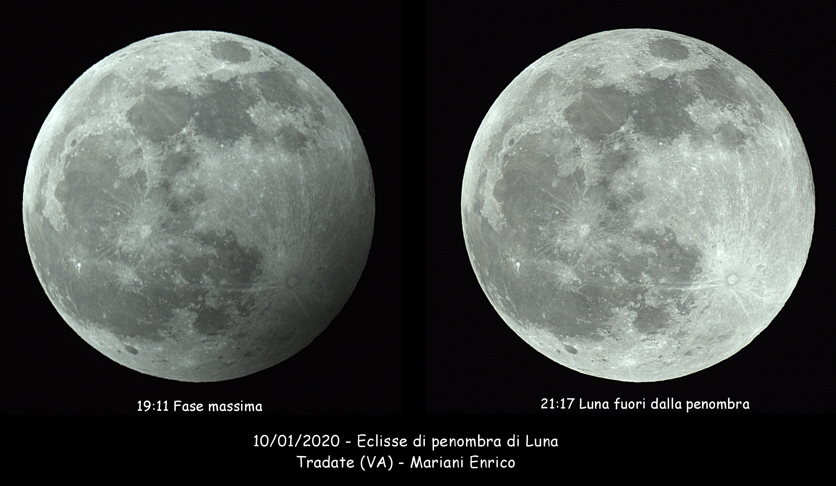 Il mosaico di due immagini riprese nel momento di massima dell’eclissi parziale di penombra della Luna e nella seconda immagine, per paragone, la Luna subito fuori dalla penombra.