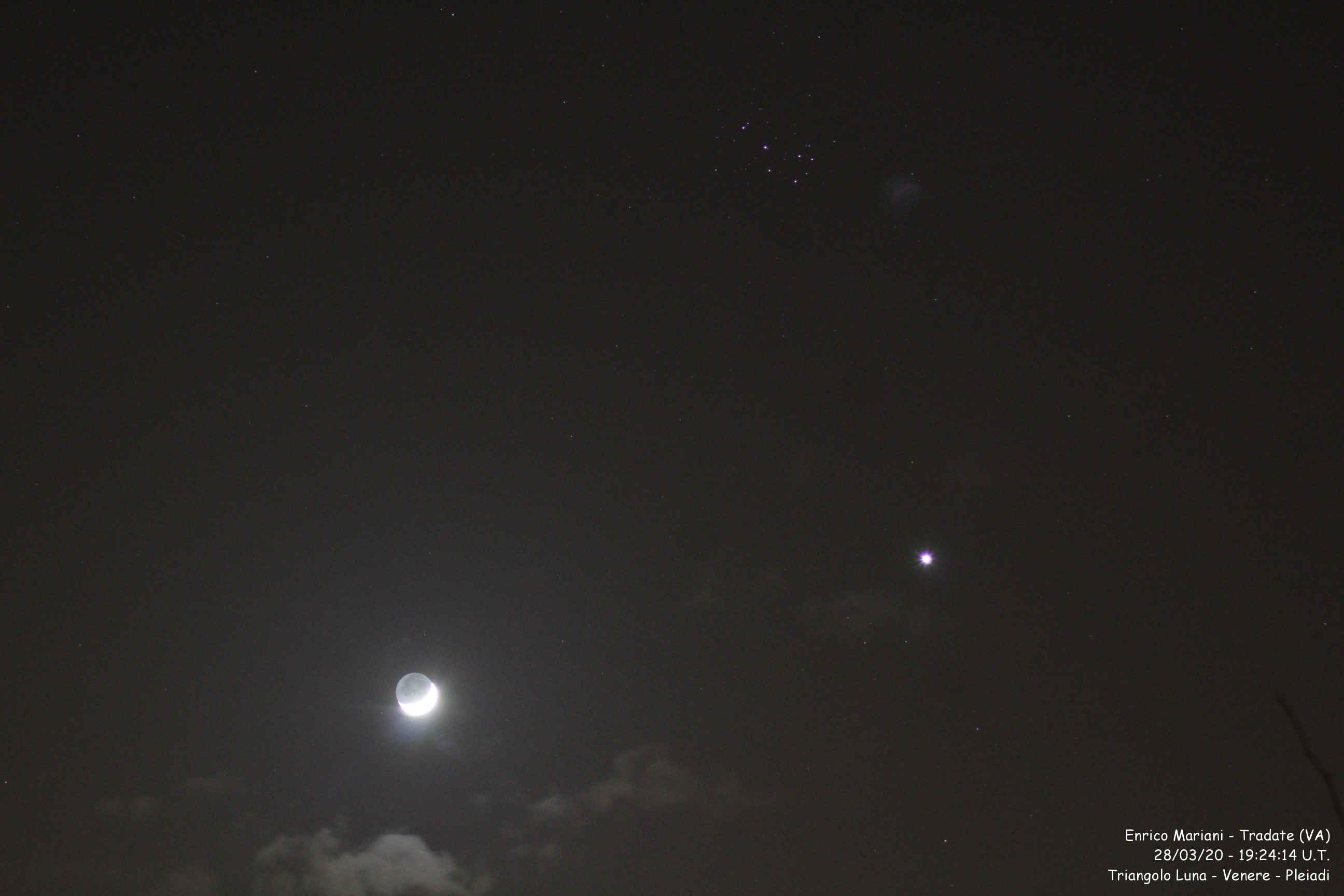 Ripresa dello spettacolare triangolo tra Luna, Venere e Pleiad