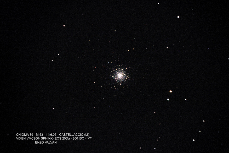 M53 nella Chioma di Berenice. telescopio Vixen VMC 200 su montatura Vixen Sphinx , singola posa di 92sec. con Canon EOS 20Da a 800iso ;