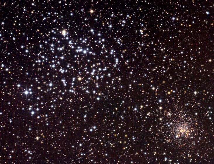 doppio ammasso prospettico,NGC2158 è circa 6 volte piu’ lontano di M35. Campo di circa 45X30′. La serata con cielo velato non ha consentito una resa cromatica eccellente.L’immagine è croppata e compressa.Elaborazione IRIS, Photoshop
