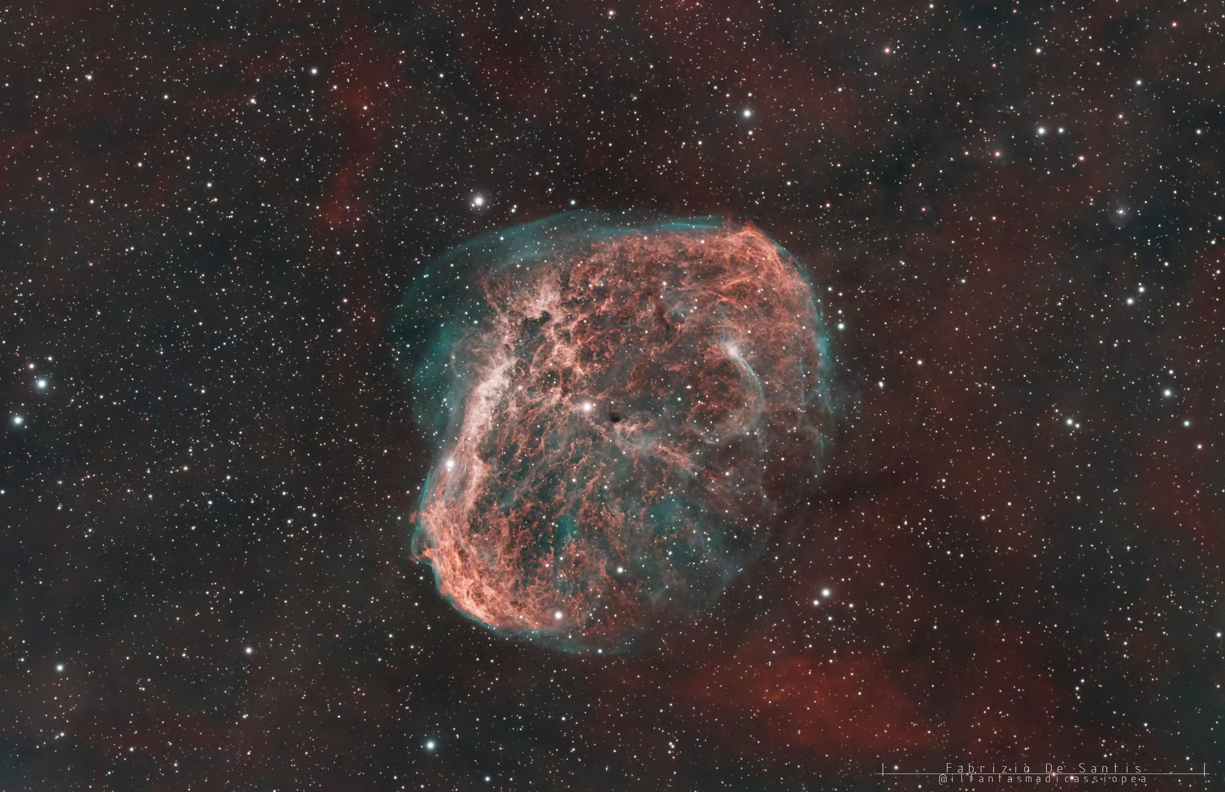 La nebulosa Crescent è una bellissima porzione di H-alfa circondata da un alone di Oiii presente all’interno del complesso del Sadr, di fianco a γ Cygni, il cuore del Cigno.