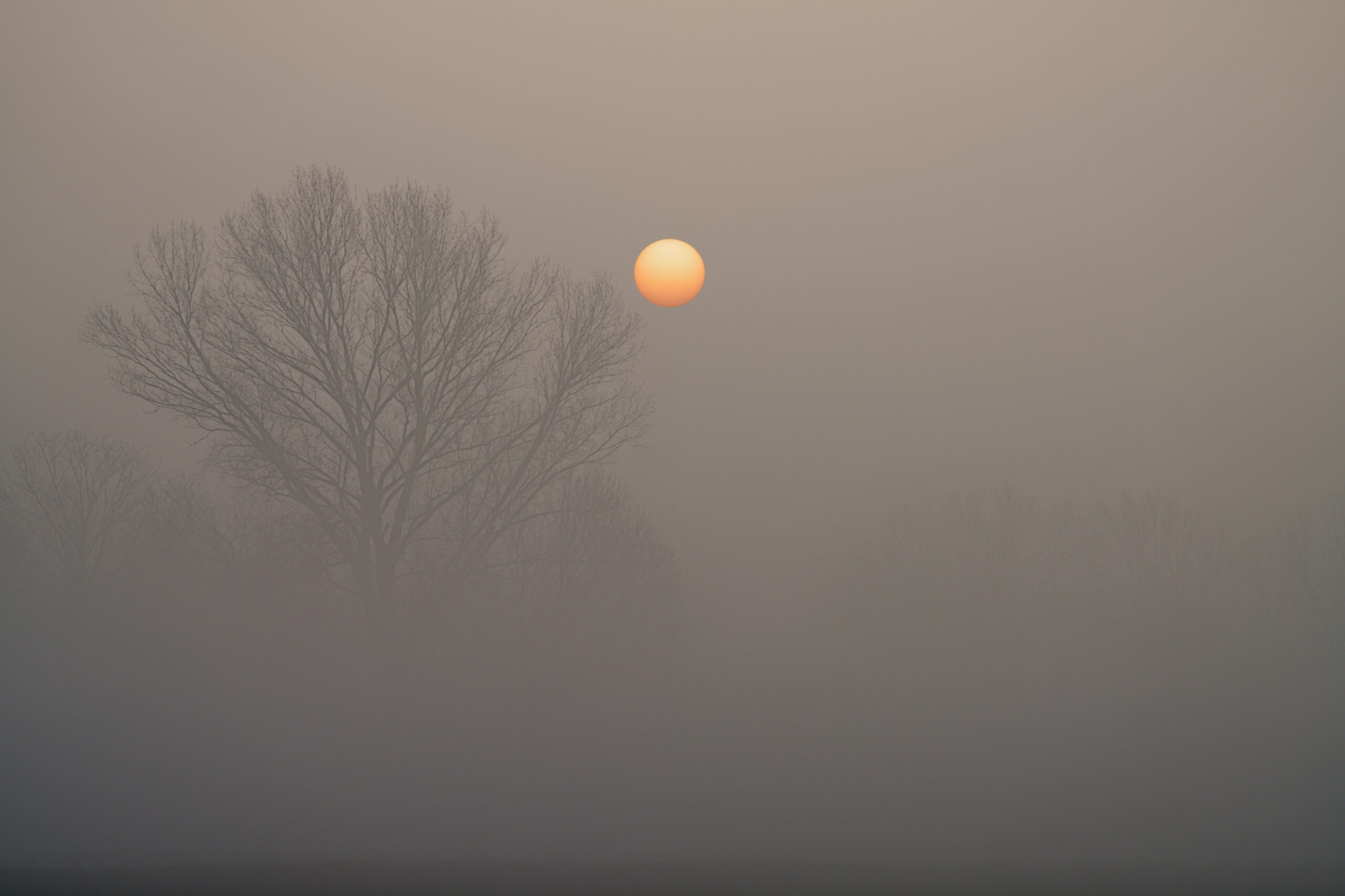 Il Sole sorge nella nebbia della pianura Padana.