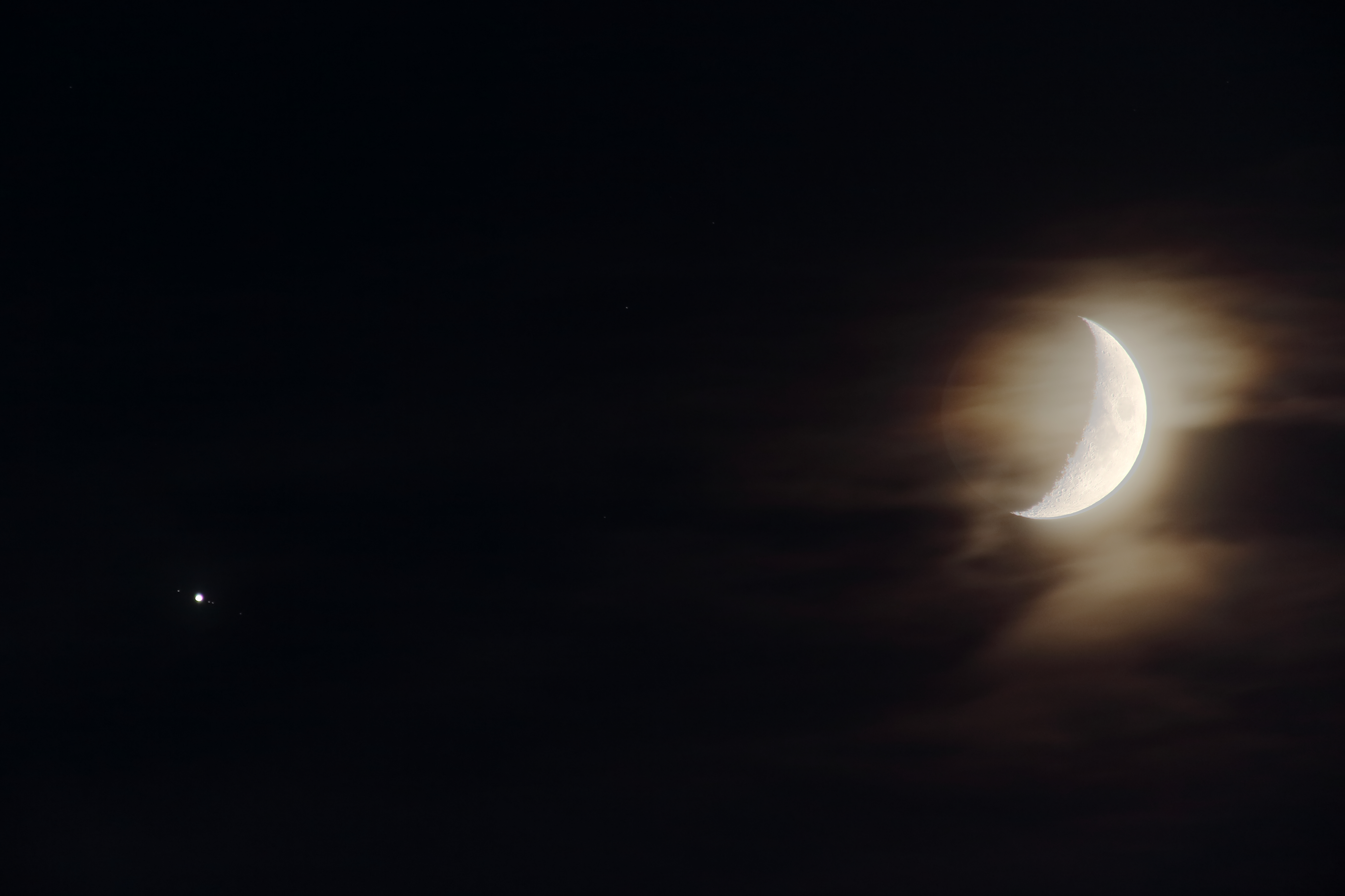La Luna crescente si avvicina prospetticamente a Giove nel cielo leggermente velato da nubi.