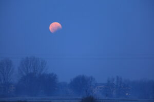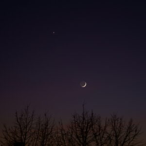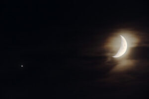 Una bella congiunzione tra la Luna e alcuni oggetti celesti: Giove, Marte, Urano, Pleiadi e Aldebaran nella costellazione del Toro; immagine ripresa a Mulazzano (LO) poco dopo il sorgere della Luna il 30/7/2024.