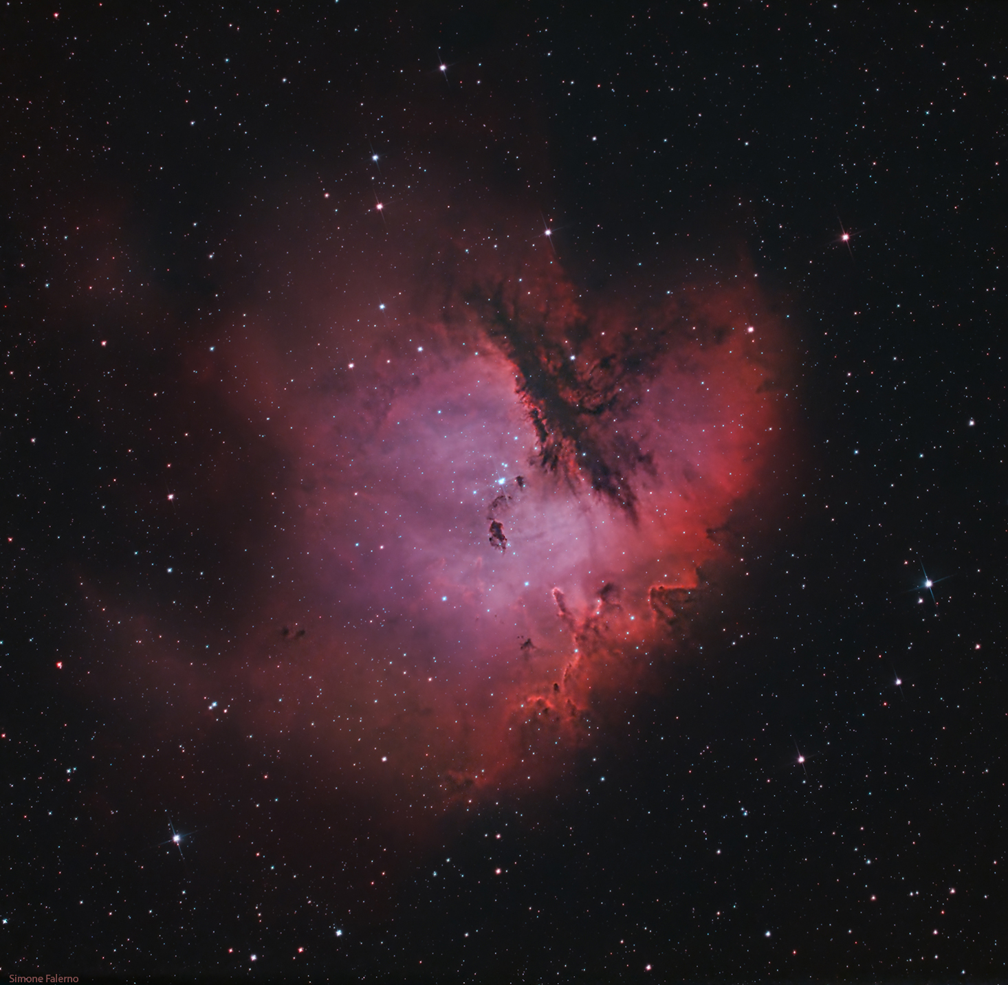 NGC 281 è una nebulosa a emissione visibile nella costellazione di Cassiopea, posta a circa 10.000 a.l. da noi. Circonda l’ammasso aperto IC 1590 e sono proprio le giovani stelle massicce dell’ammasso, nate all’interno della nube, ad alimentare il suo bagliore diffuso . E’ anche nota come Nebulosa Pacman, a causa della sua forma che ricorda il celebre videogioco.