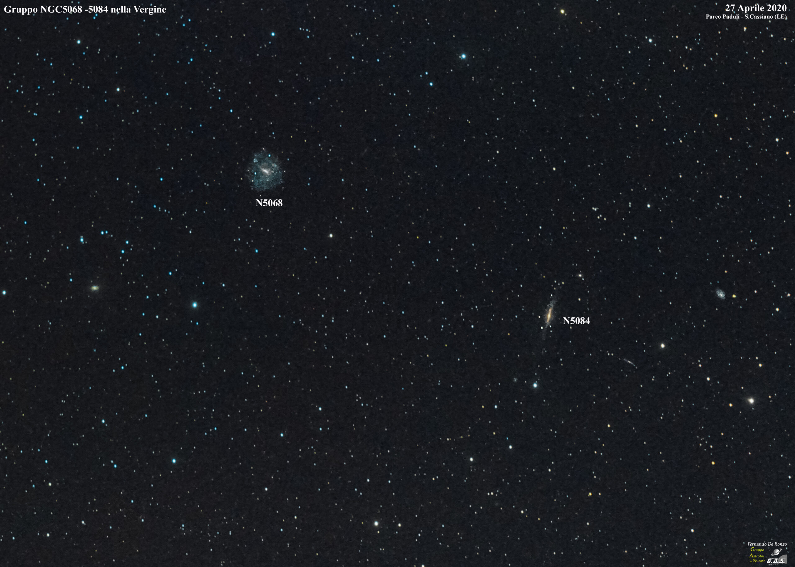Otto gradi a sud di Spica (alpha Vir) poco distante dalla stella Cauda Hydrae, è visibile questo affascinante gruppo di galassie le più importanti sono la NGC5068 una galassia a spirale barrata distante circa 22 milioni di a.l. e la NGC5084 una galassia lenticolare distante circa 80 milioni di a.l. con una dimensione circa il doppio della nostra Via Lattea, intorno ad esse altre galassiette che fanno da contorno.