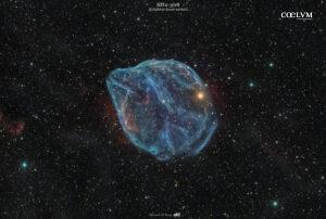 La costellazione dell’Unicorno nasconde fra le sue stelle questo affascinante quadretto composto da due nebulose ad emissione il cui insieme mi fa pensare al rinomato film d’animazione del 1991 La bella (in alto) e la bestia (in basso). La SH2-280(in basso a sinistra) è una regione H II di grandi dimensioni, posta sul Braccio di Perseo nella stessa regione galattica della più rinomata Nebulosa Rosetta e dell’associazione OB Monoceros OB2, distante circa 5500 anni luce i suoi gas sono ionizzati dalla stella blu di sequenza principale HD 46573, di classe spettrale O7 , posta al centro della nebulosa. La SH2.282 (in alto dell’immagine) è anch’essa una regione HII al cui interno sono note diverse strutture cometarie, che indicano la presenza di fenomeni erosivi causati del vento stellare delle stelle massicce di classe spettrale O e B più vicine, e in particolare di HD 47432, una gigante blu variabile pulsante visibile sul lato nordorientale della nebulosa. Distante circa 4100 anni luce la sh2-282 si trova nello stesso ambiente galattico dell’associazione Monoceros OB2, legato alla Nebulosa Rosetta e situato sul bordo interno del Braccio di Perseo