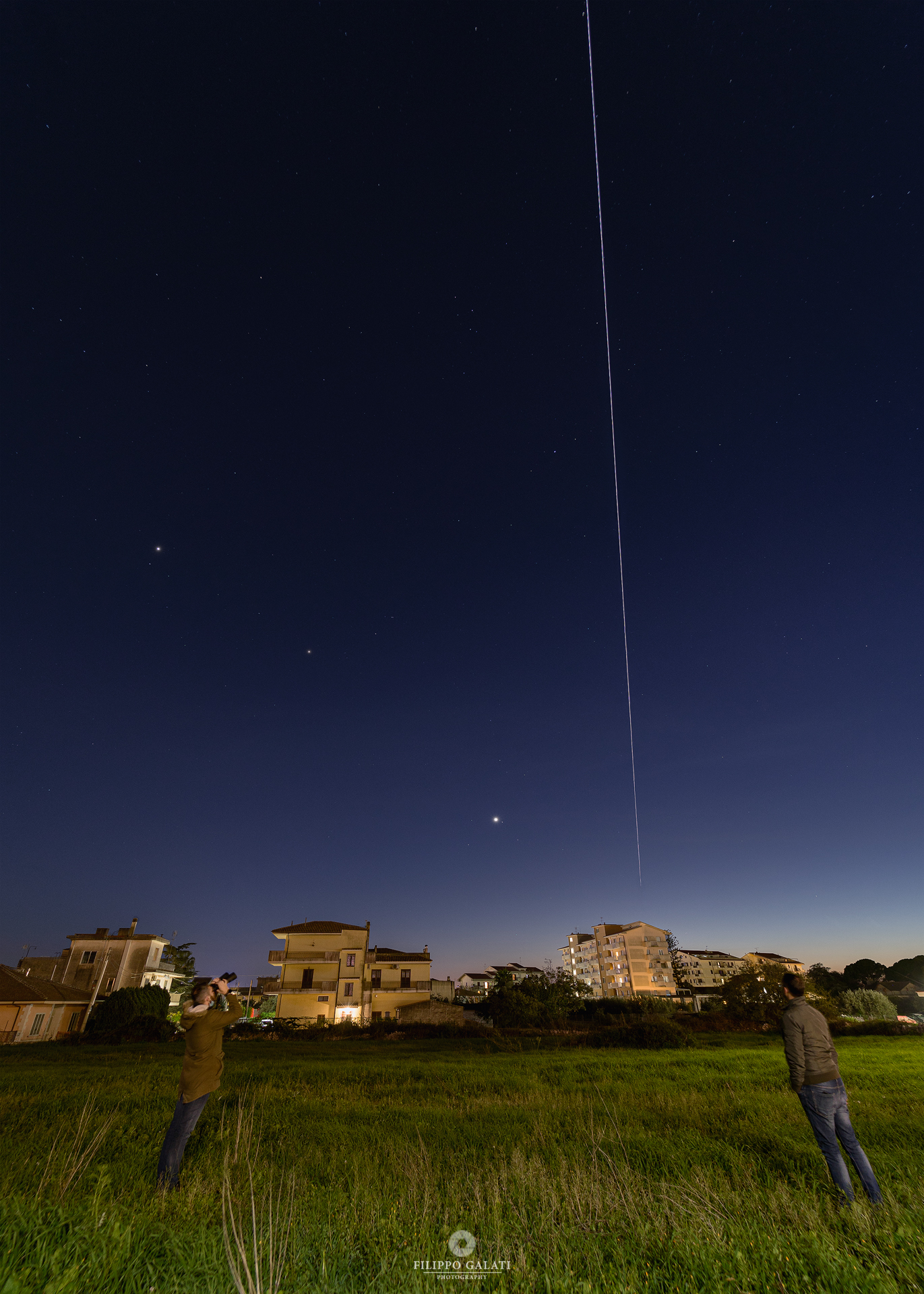 Subito dopo il tramonto del 20 Novembre, la Sicilia è stata protagonista di un passaggio molto favorevole e luminoso della ISS. Il passaggio è avvenuto tra le 16.41UTC e le 16.47 UTC, subito dopo il distacco della capsula Cygnus, da Sud-Ovest a Nord-Est attraversando quindi l’intera volta celeste. Il tutto è stato impreziosito dalla presenza di tre pianeti: Venere, Saturno e Giove allineati diagonalmente (dal basso verso l’alto)