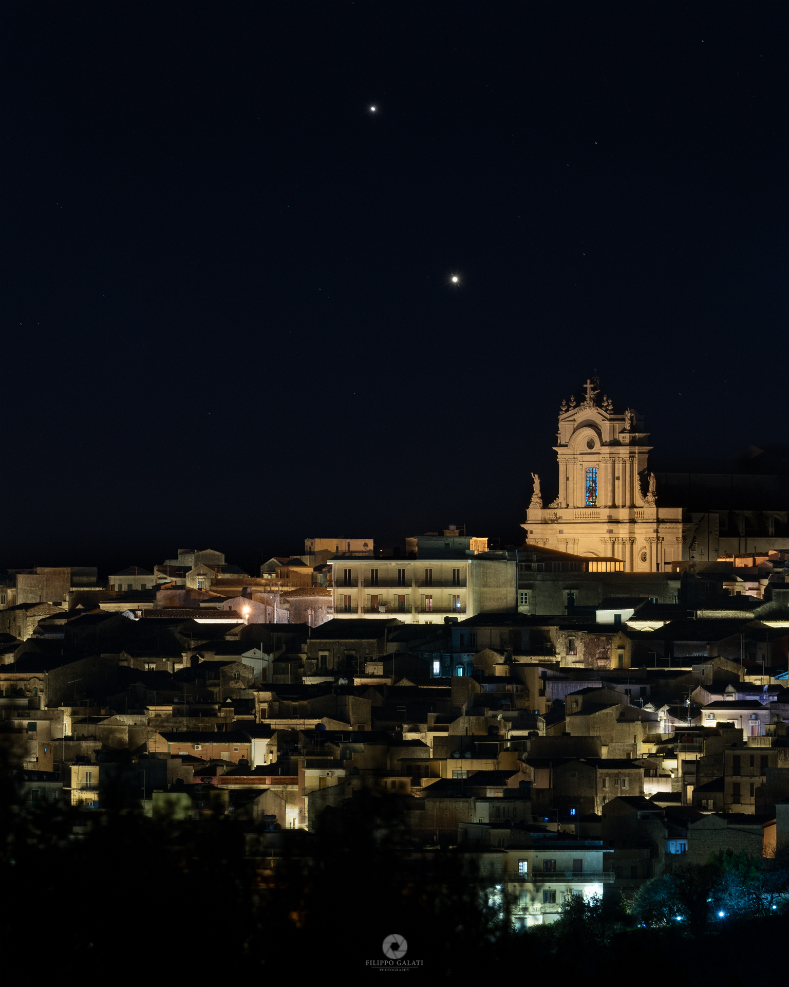 Giove (in basso) e Saturno (poco sopra) sempre più vicini su Modica, raggiungeranno il punto più vicino il 21/12. Una congiunzione così tra i due giganti del sistema solare non accadeva dal 1623, in pratica dai tempi di Galileo Galilei. Nello scatto è possibile ammirare anche i 4 satelliti principali di Giove scoperti proprio da Galileo.
