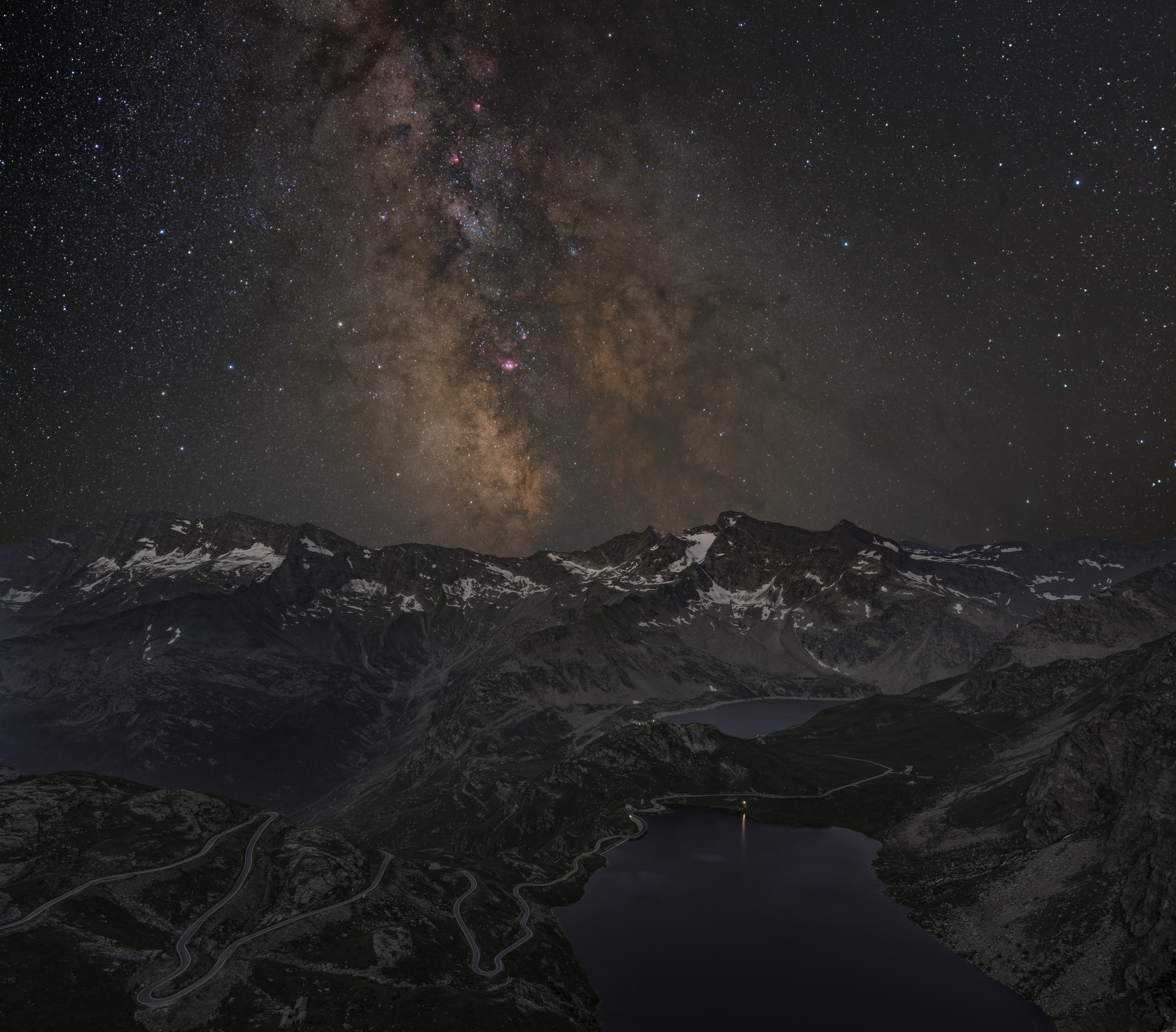 Via Lattea sul Nivolet ottenuta con 60 scatti da 1′ inseguiti per il cielo con astroinseguitore StarAdventurer e Canon 1100D modificata e Samyang 14mm f1.4 (chiuso a f2.8) a 800ISO; più uno scatto singolo con Sony a7R3 + Zeiss 16/35 da 240" a f5.6 e 100ISO per il primo piano